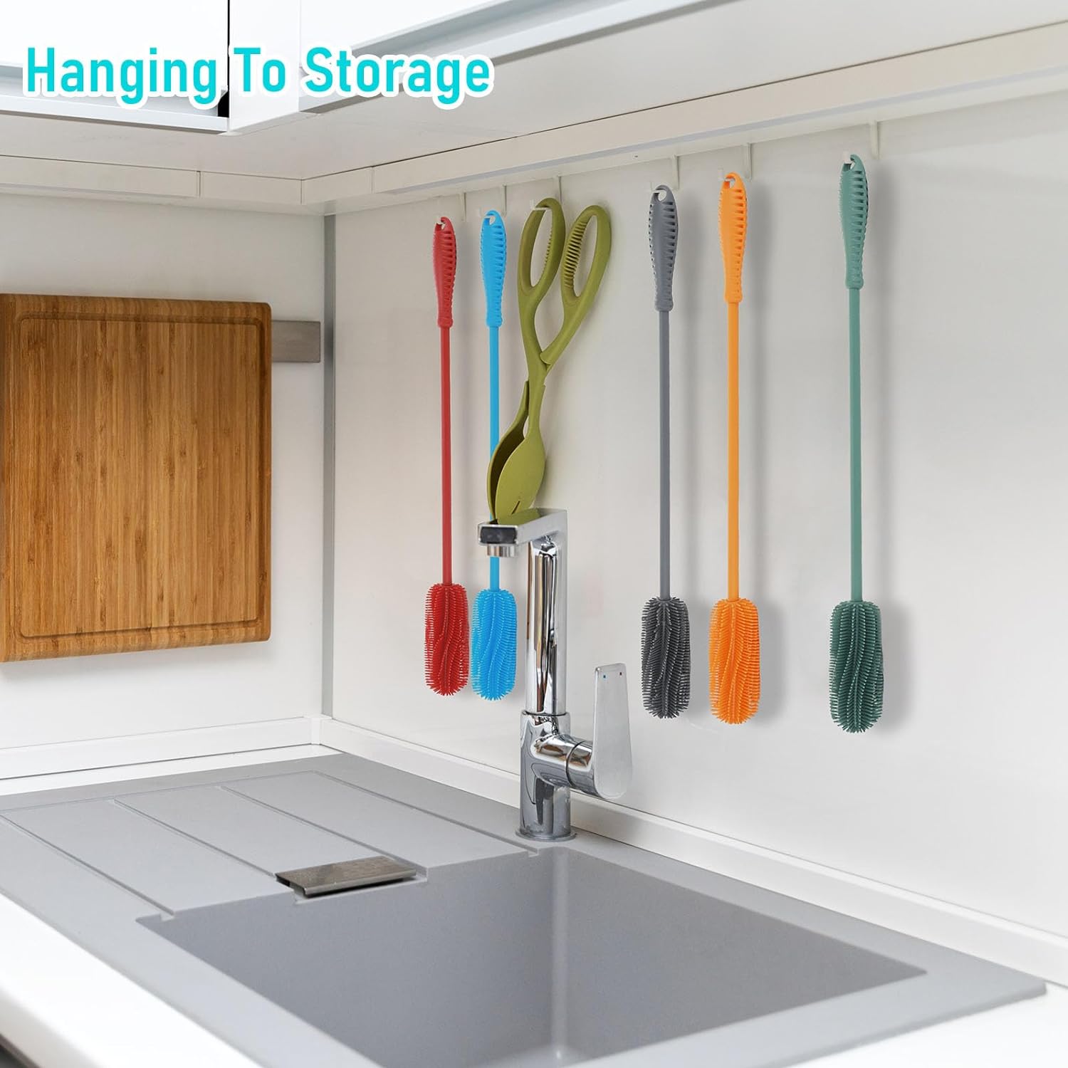 - 【No More Scratches】Our water bottle brush is made of high-quality silicone, sturdy and durable yet gentle enough. The long bottle cleaning brush won't scratch the sides or bottom of the bottle. Even after prolonged use, there are no signs of wear or damage