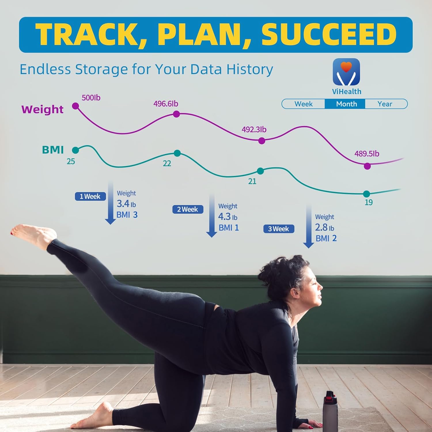 - Effortless Progress Tracking: This Bluetooth scale automatically syncs data to your smartphone. The APP provides weight and BMI trends on a weekly, monthly, and yearly basis, making it easy to track your fitness progress. It also sync with popular fitness apps like Fitbit, Google Fit and Apple Health for comprehensive health management. Additionally, the Baby/Pet Mode allows you to track weight changes for your little ones and pets, making it the perfect body scale for the whole family.