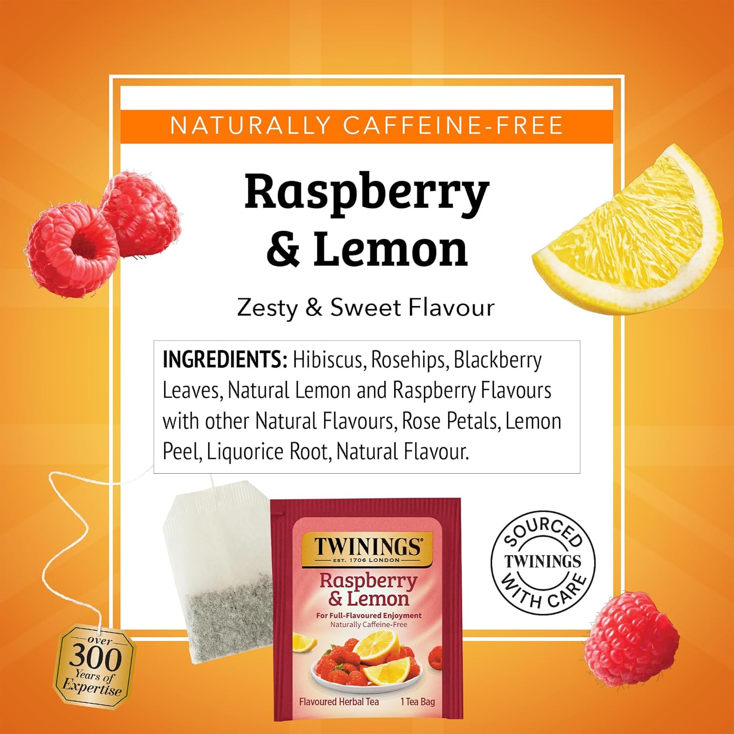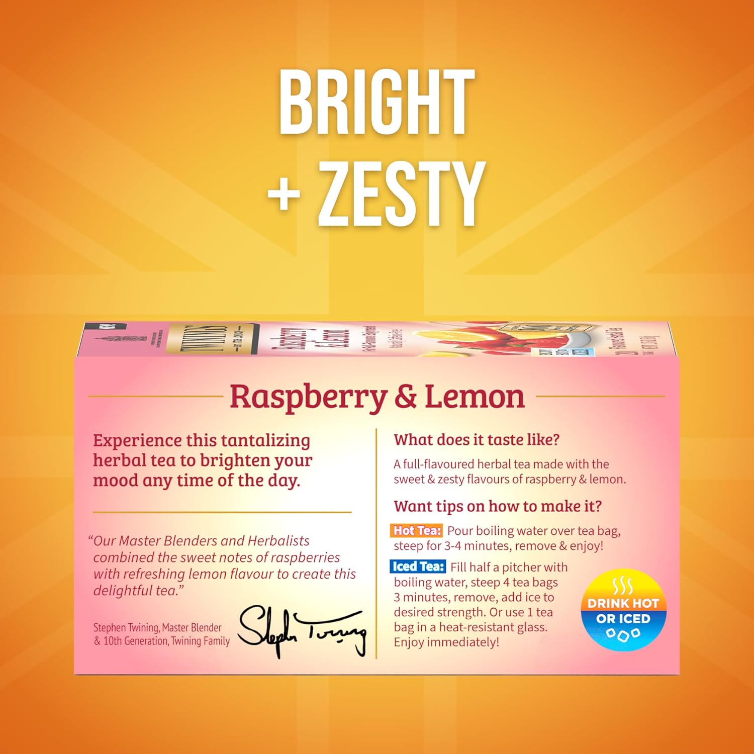 Twinings Raspberry & Lemon Herbal Tea Individually Wrapped Bags, 20 Count (Pack of 1), Unsweetened, Refreshing & Fruity, Naturally Caffeine-Free, Enjoy Hot or Iced, 20 Teabags