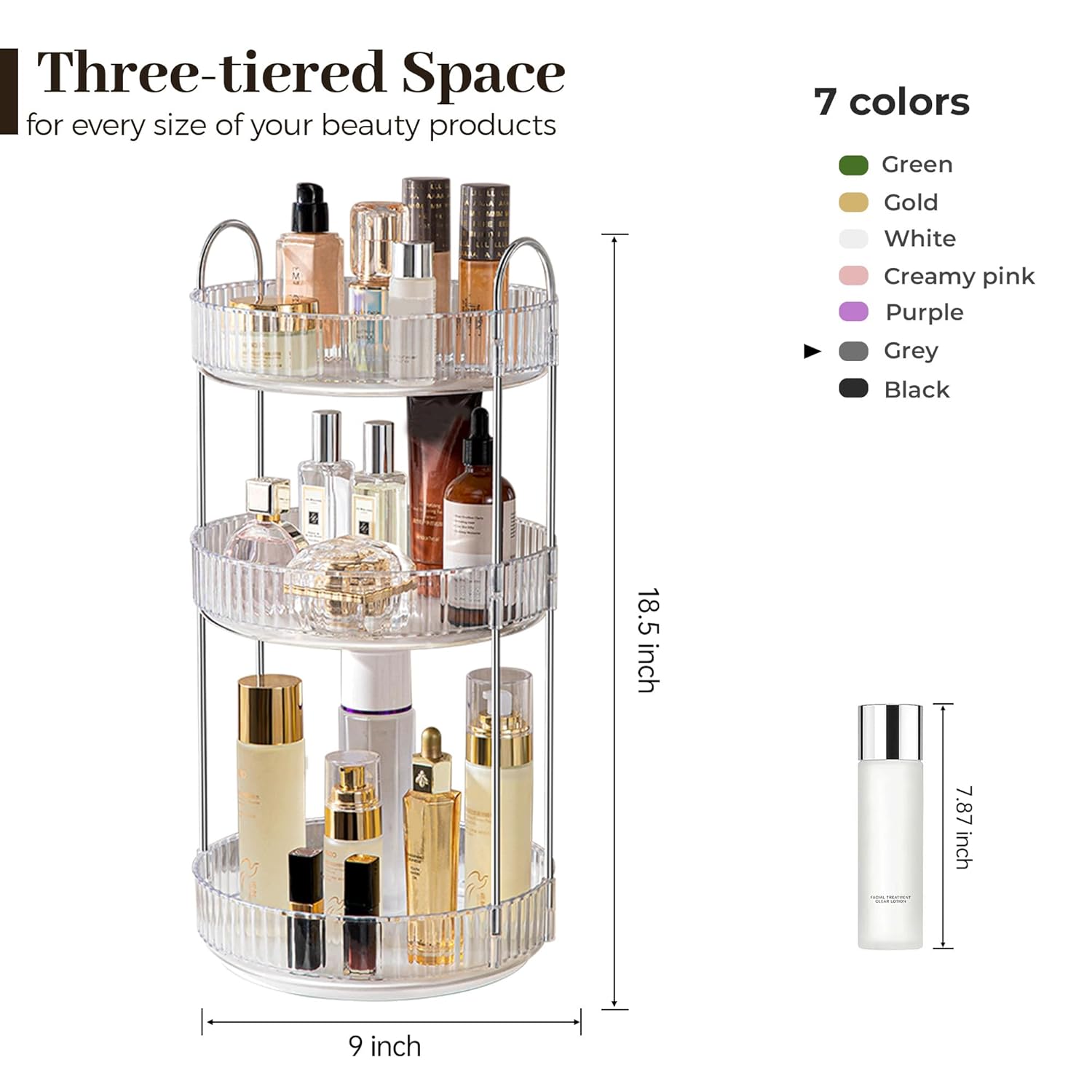 Aveniee Rotating Makeup Organizer for Vanity, 3 Tier Perfume Skincare Organizers and Storage for Bathroom Countertop, Clear Spinning Counter Cosmetic Holder for Dresser,Grey