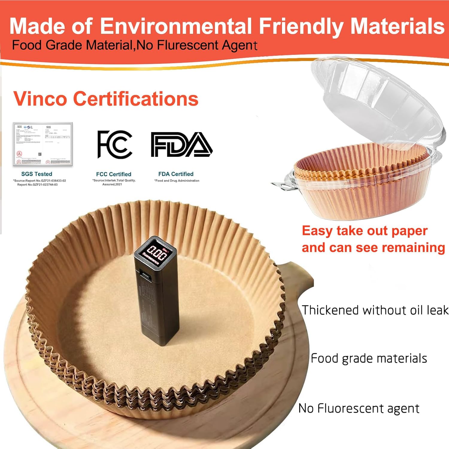 - 【Healthy and Reliable Material】Air fryer paper liners made out of unbleached,natural wood pulp. 1.5 times thicker than ordinary parchment to be durable and sturdy, and won’t tear when lifting even after cooking.