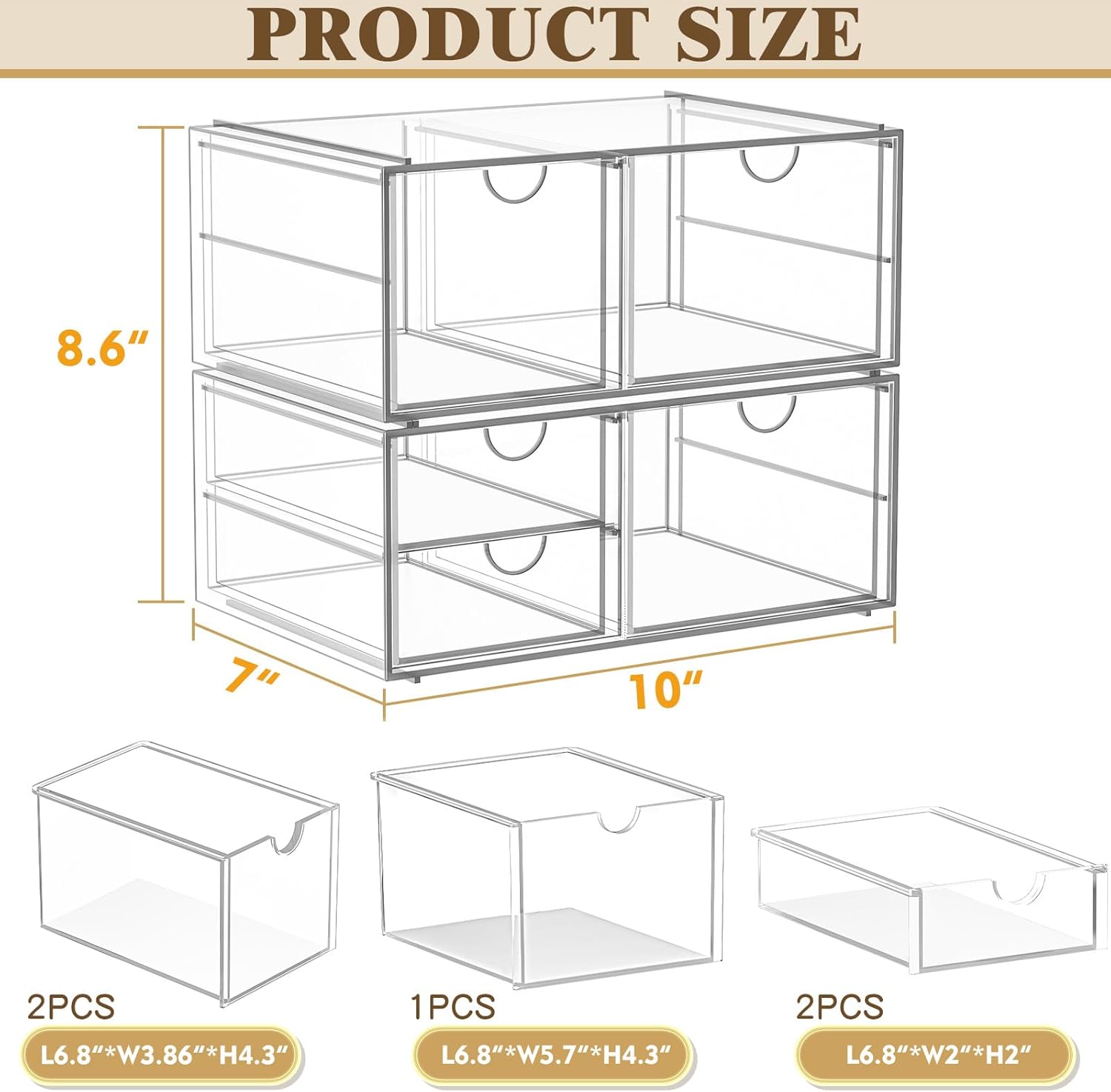 - Acrylic makeup organizer with 5 Drawers - Our Acrylic makeup bathroom organizer can maximize space on shelves, dressers ,under the sink, and bathroom counters. There are 5 drawers in total, it’s perfect to organize all your messy items into section, and very easy to take. You can also use them side by side, put your small objects on top of acrylic bins to make your countertop space more tidy. And 4 Pack storage bins with 5 drawers are also enough for you to place in multiple places, very good value.