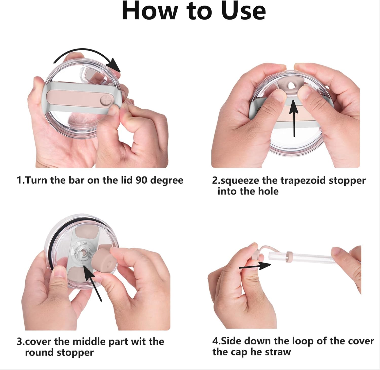 - Place the straw cover cap on the straw to prevent dust; Squeeze the square spill stopper into the sip part to seal for anti leak purpose; Round lid spill stopper is installed underneath the cup lid, press it downwards