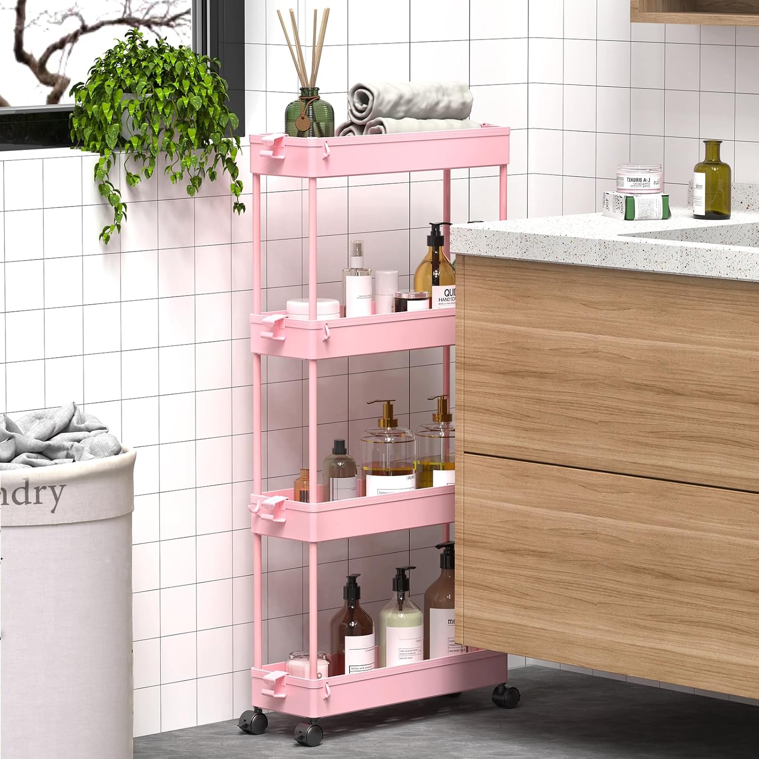 SPACEKEEPER Slim Rolling Storage Cart 4 Tier Bathroom Organizer Utility Cart Mobile Shelving Unit Tower Rack for Kitchen, Laundry Room, Bathroom, Narrow Places, Pink