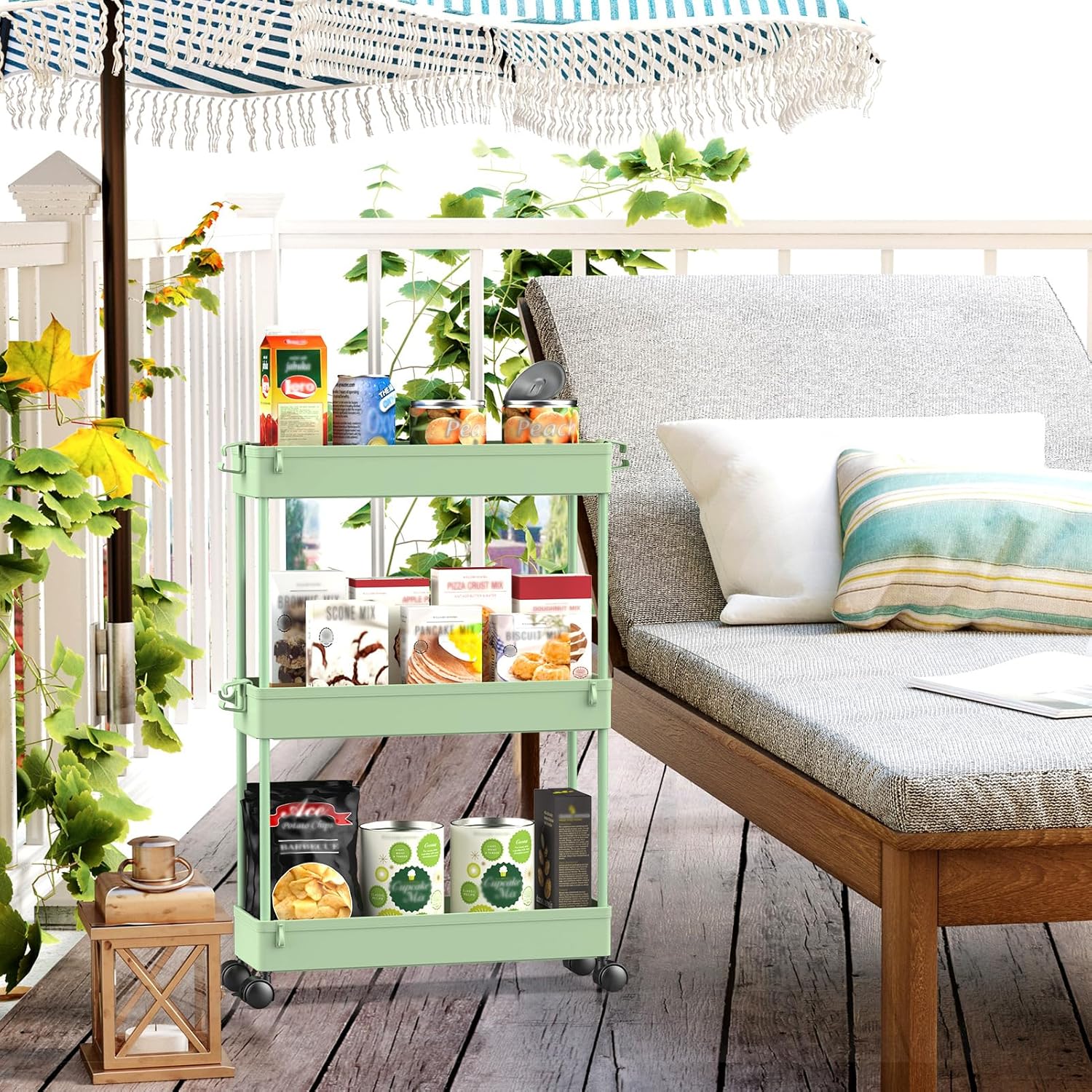 - [Flexible 3-Tier Storage Cart with Removable Shelves] This slim rolling cart features 3 removable shelves, allowing you to customize the storage layout as needed—use 3 tiers for maximum capacity. Its slim feature make it easily fit in narrow spaces in your home. Ideal for bathrooms, kitchen, garage, closet, laundry rooms, offices or between appliances.