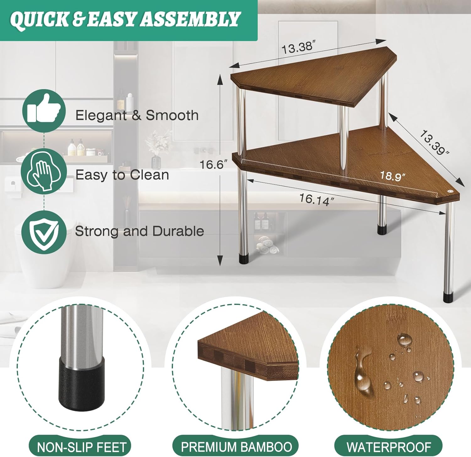 - MORE STEADY AND STABLE: Our bathroom counter organizer made of natural bamboo and stainless steel tubes makes this corner shelf more stable and durable, also add 3 rubber non-slip feet can protect your countertop surface better
