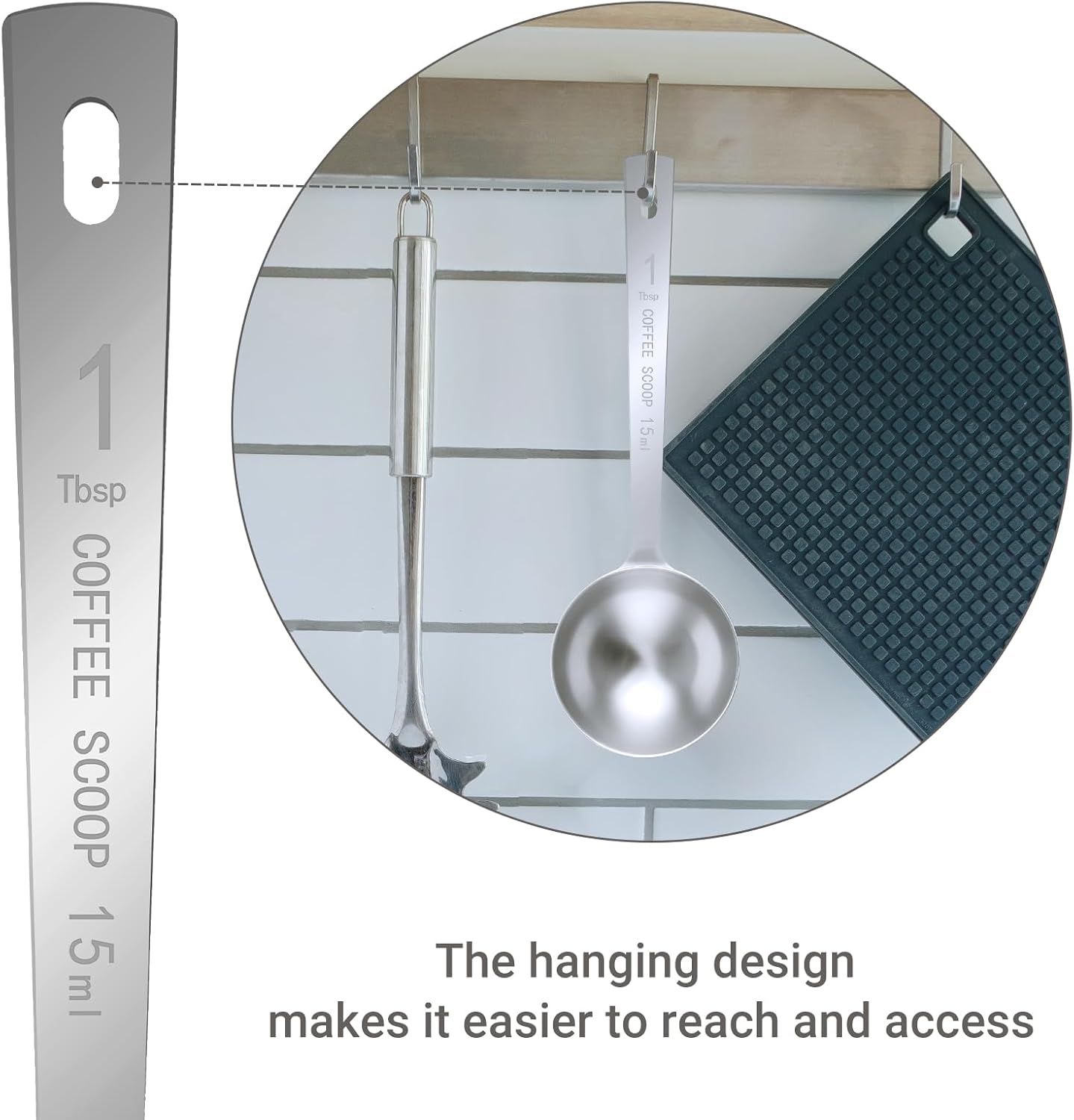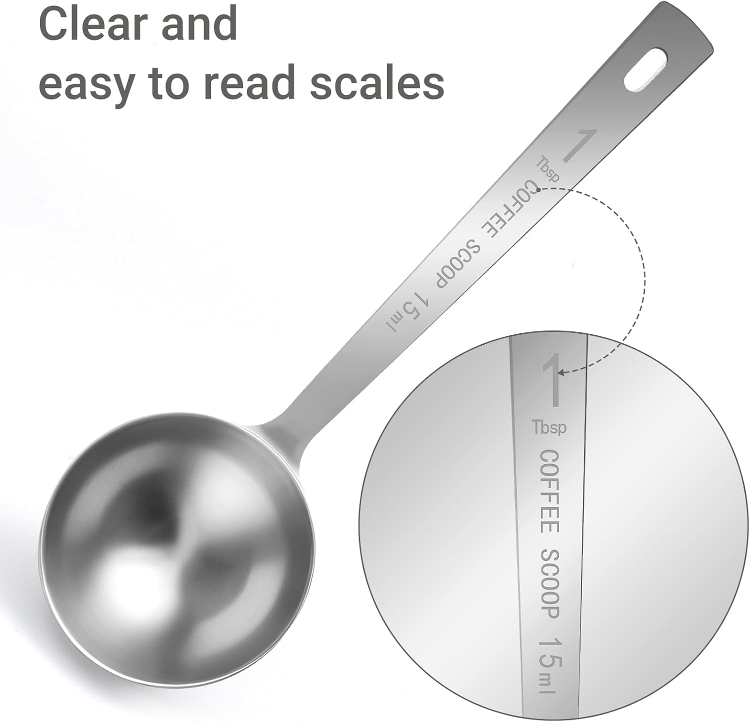 - Unique Design: The tablespoon measuring spoon features a long handle for a comfortable grip. It is thoughtfully hanging designed at the end of the metal scoop handle, allowing it to be conveniently hung on a hook or strung on a string and hung on a jar. Moreover, the measurements on the 1 tablespoon scoop are clear and easy to read. This tablespoons is ideal for accurately measuring and scooping both whole bean and ground coffee. It can be stored in a generously sized coffee container.