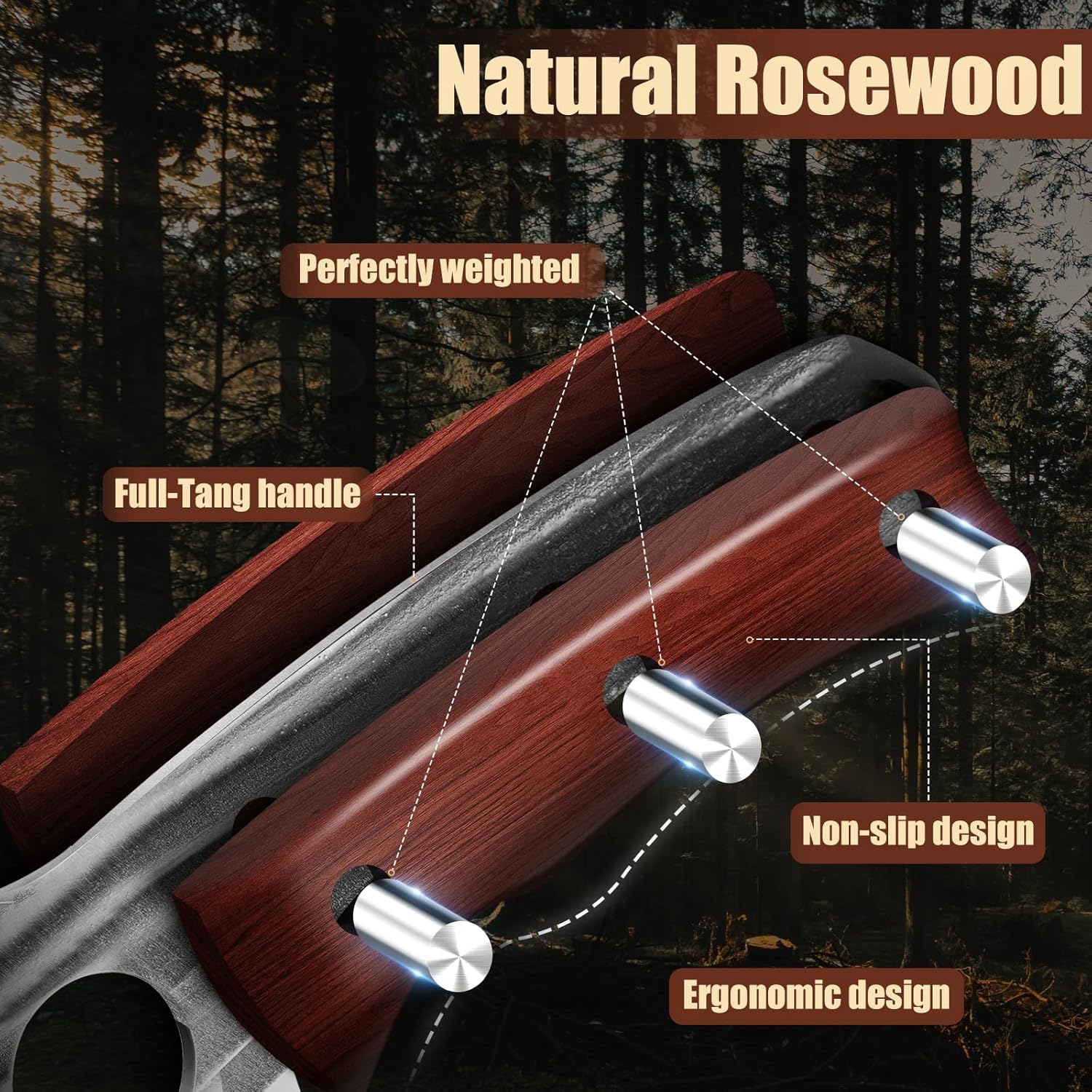 - PROFESSIONAL DESIGN: The ergonomic full tang handle is made of high-grade rosewood and weighted with three shank rivets for excellent balance and comfortable grip, as well as highly waterproof, colorfast and wear-resistant. The precision laser-engraved finger hole on the blade gives you perfect integrated control over the knife, maximizing the cooking enjoyment.