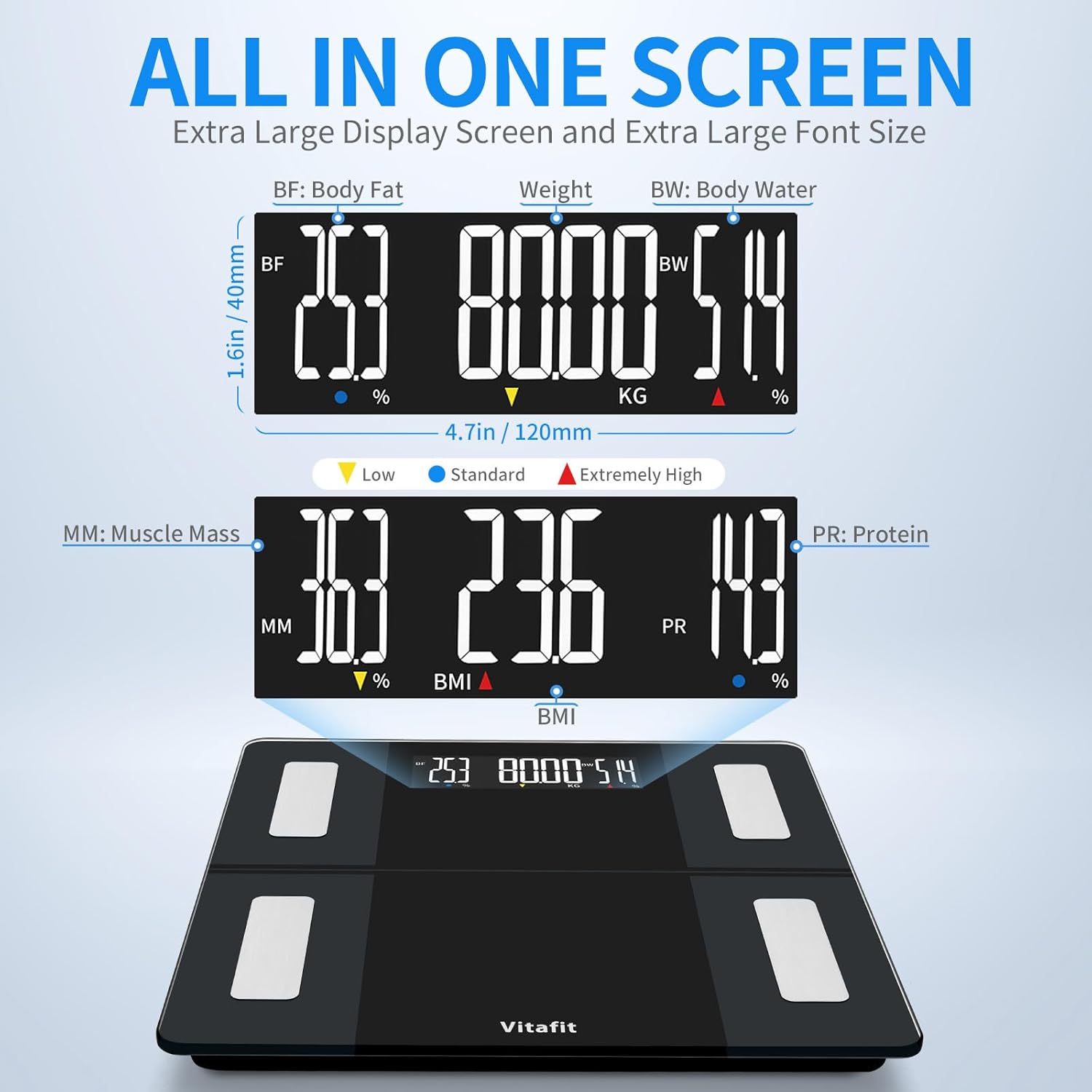 - All in One Display: When connected with Vitafit App, our body fat scale will display 6 main body composition measurements, including body weight, BMI, body fat, body water, muscle mass and protein. Let's conveniently enjoy our fitness journey together.