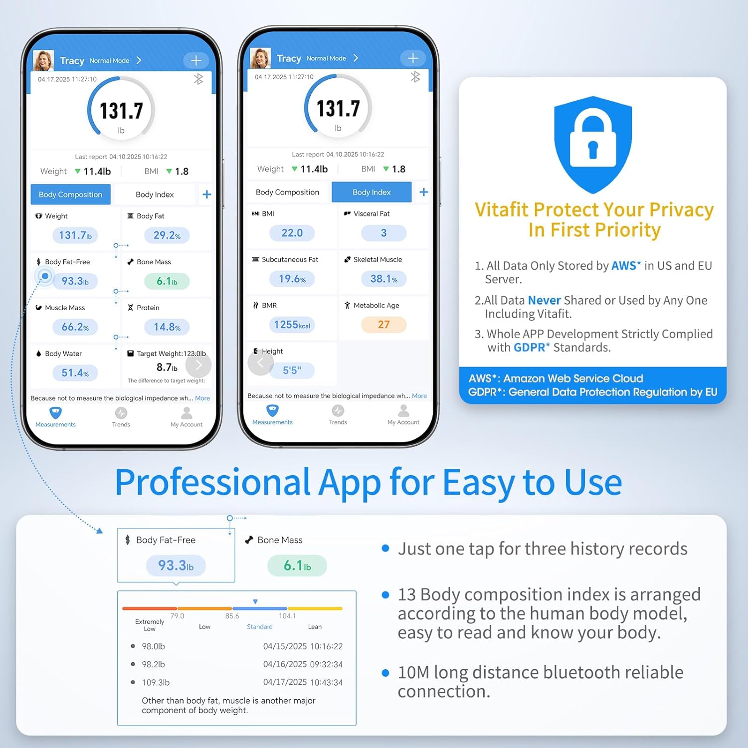 - SERIOUS PRIVACY AND EASY SETUP - All user data of Vitafit App is secured and stored in US and EU Cloud Server via AWS( Amazon Web Services). We protect your personal PRIVACY by best-in-class standard. The weight scale is super convenient to create unlimited users for family and friends, special Zero-Current mode for pregnant, baby and child to only measure weight and BMI. Our professional app already enjoyed by 3.1M+ App Users.