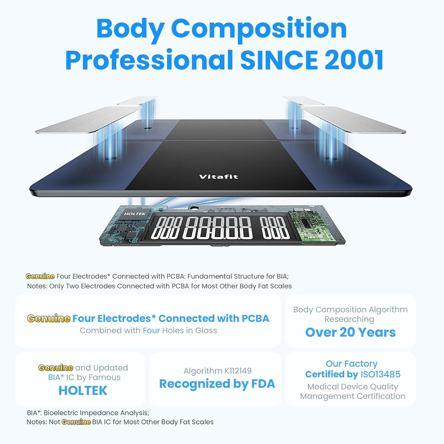 - AMAZING ACCURACY CHOICE - Our-owned professional factory has been focusing on high quality scales SINCE 2001. We make the smart scale for body weight and fat with up-to-date expertise, and proudly guarantee not only capacity 550lb/250kg in high 0.1lb/0.05kg accuracy, but also body composition index credible. Our professional team has been researching and developing GENUINE BIA technology and algorithm over 20 years, which highly recognized worldwide.