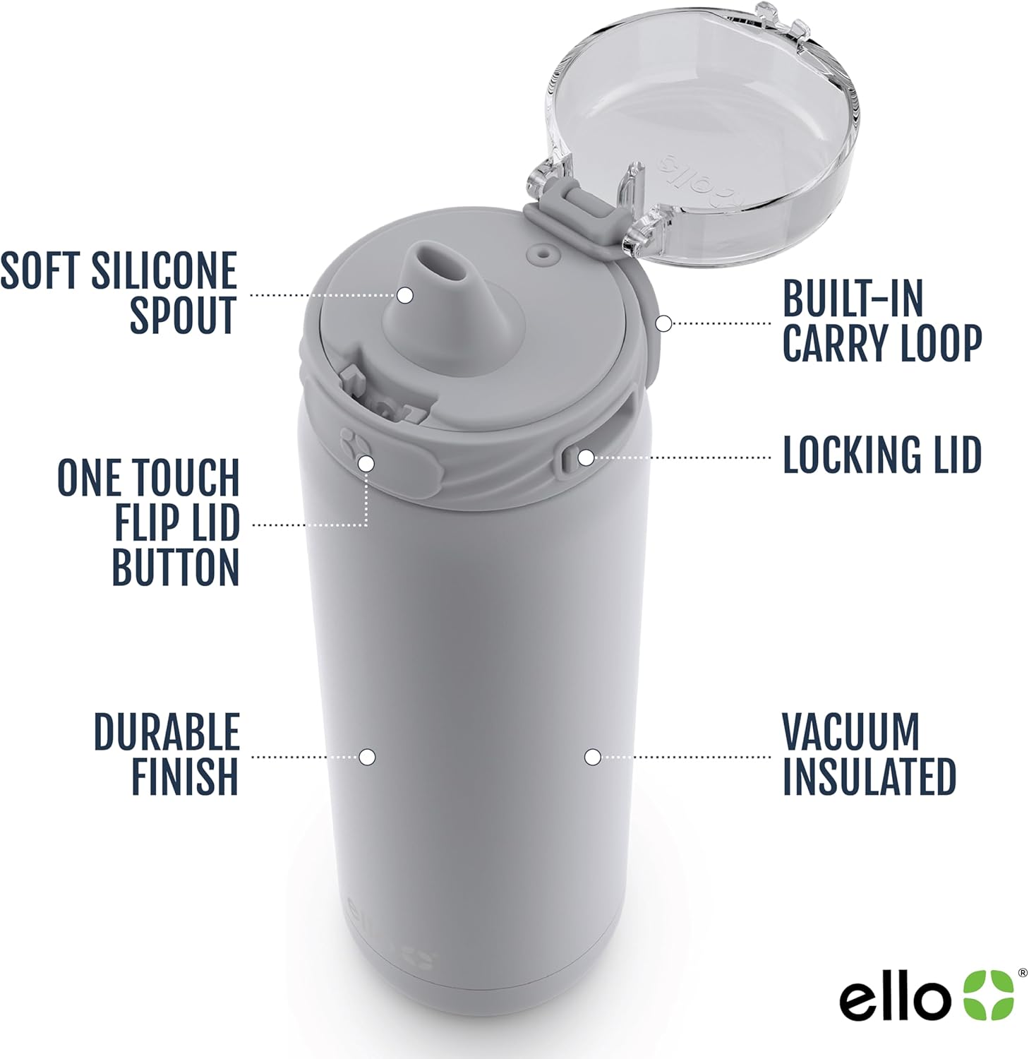 Ello Cooper 40oz Stainless Steel Water Bottle with Straw and Carry Handle, Double Walled and Vacuum Insulated Metal, Leak Proof Locking Lid with Soft Silicone Spout, Reusable, BPA Free, Grey