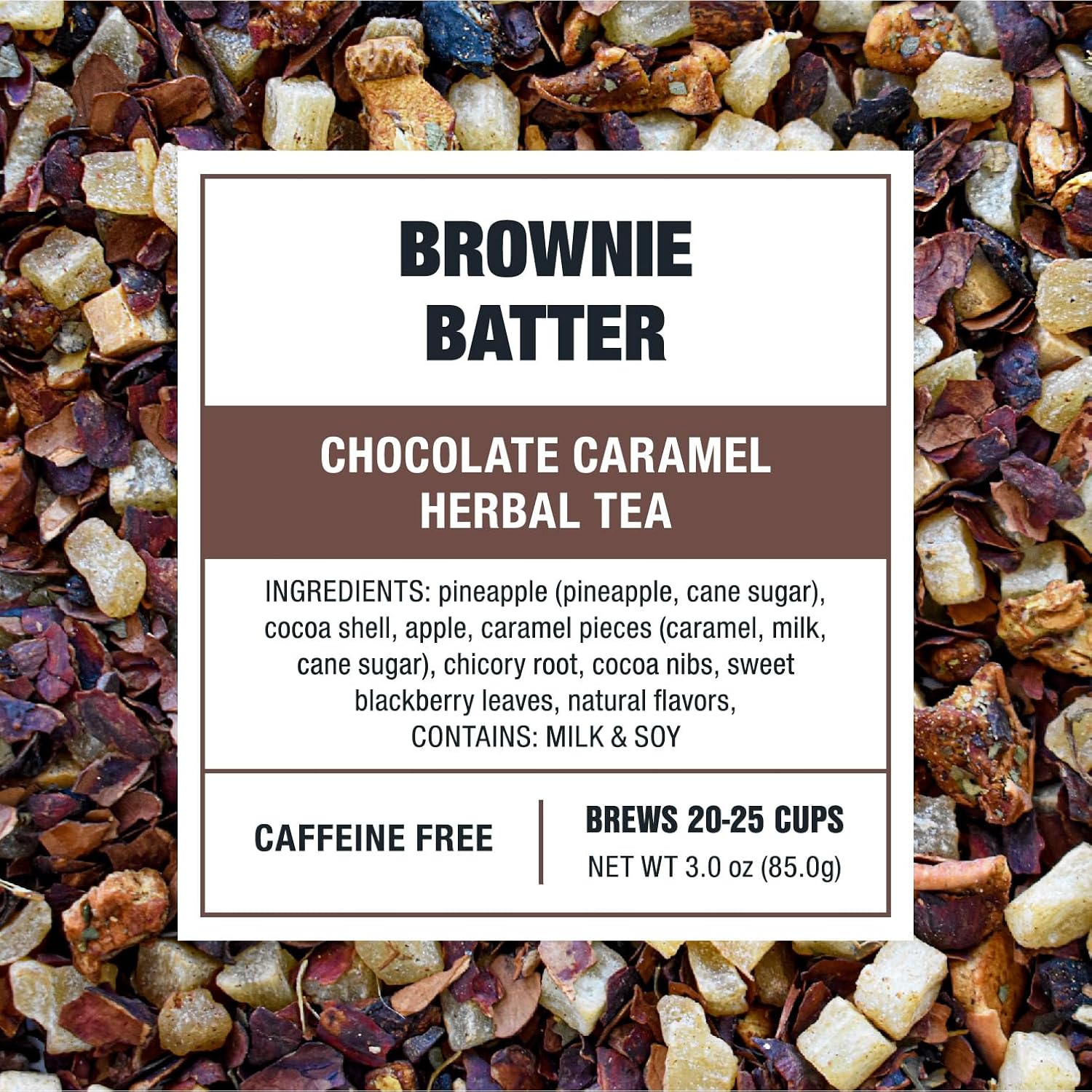 - PREMIUM LOOSE LEAF INGREDIENTS: Our Brownie Batter Tea blends natural ingredients like sweet pineapple, rich cocoa shells, apple, caramel pieces, chicory root, cocoa nibs, and sweet blackberry leaves. This carefully crafted mix delivers a decadent, chocolatey flavor with a subtle sweetness. Enjoy a rich, indulgent tea experience with every cup. Please note: this product contains milk and soy.
