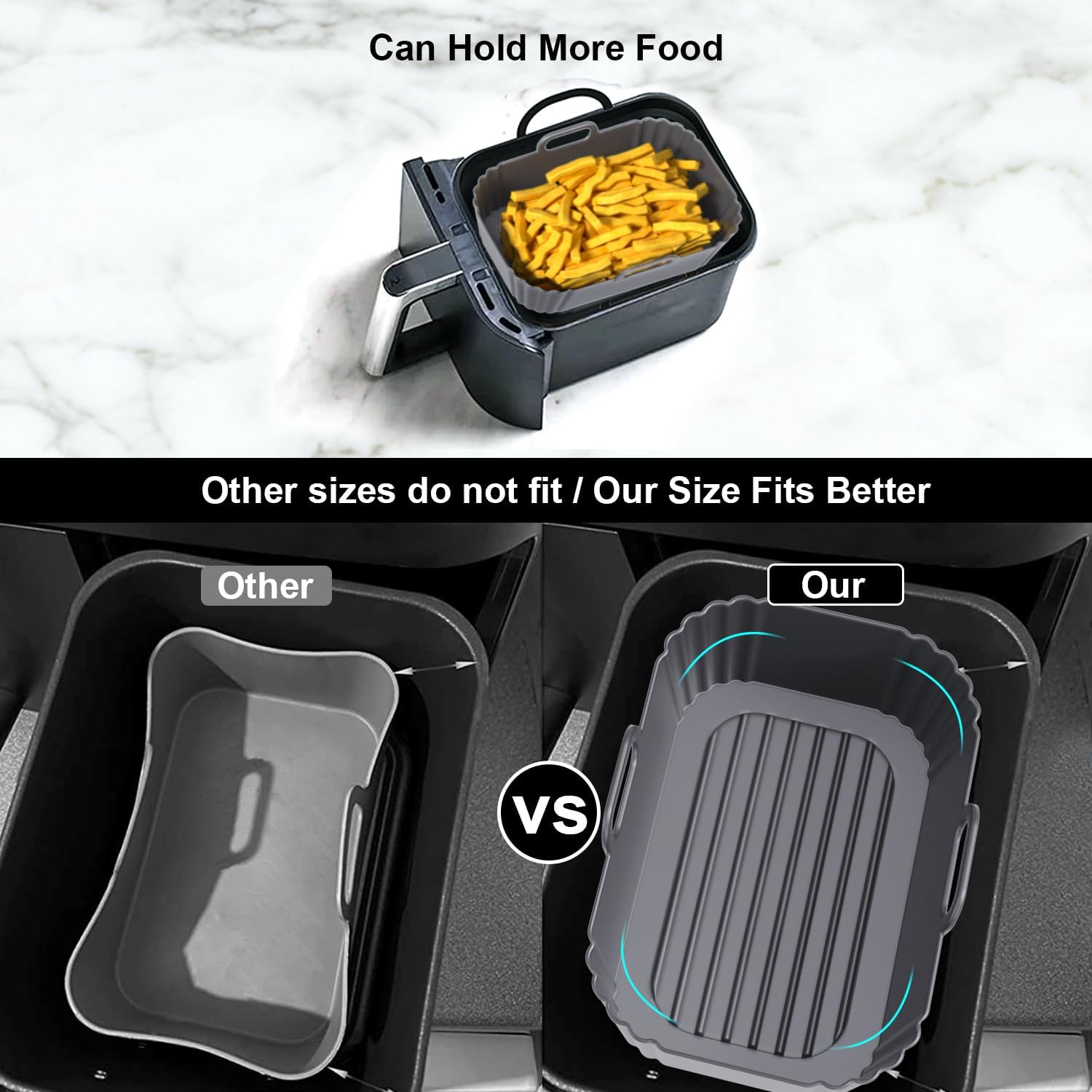 - 【Custom Design for Perfect Compatibility】 The dimension of this product is 8.67x5.9X2.68inches, which is high enough to leave no space of the inside of the fryer wasted. The bottom of the liner comes with raised silicone strips, which separates food from oil produced during cooking and reduces your intake of fat. It also contributes to the air circulation within the liner which helps reduce cooking time and save up on utility bills.