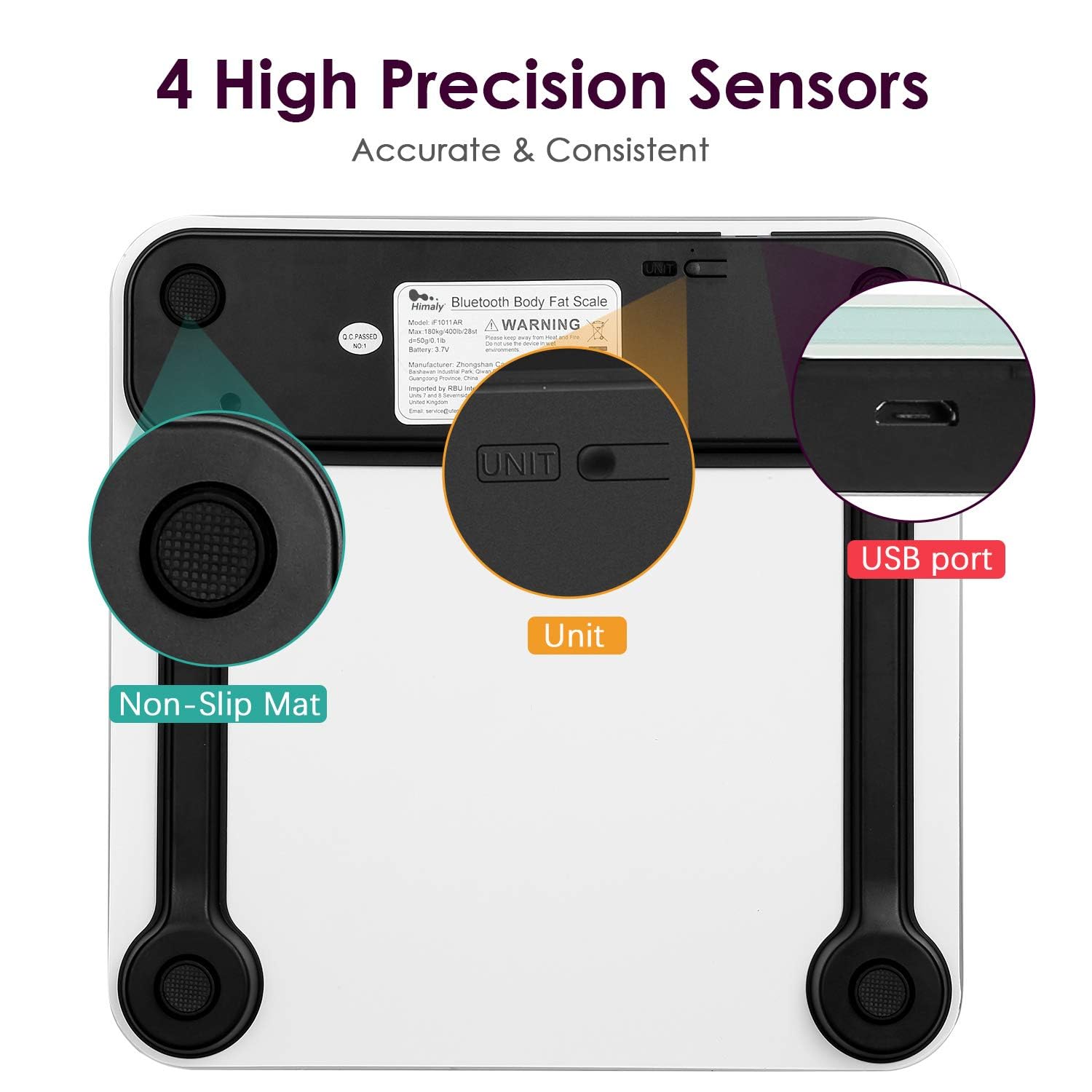 - Precision and Reliability: Featuring 4 high-precision sensors, our weight scale delivers accurate measurements in increments of 0.2 lb or 0.05 kg, with a maximum capacity of 400 lb/180 kg. Plus, it uses color-coded displays to reflect different body fat levels for easy interpretation