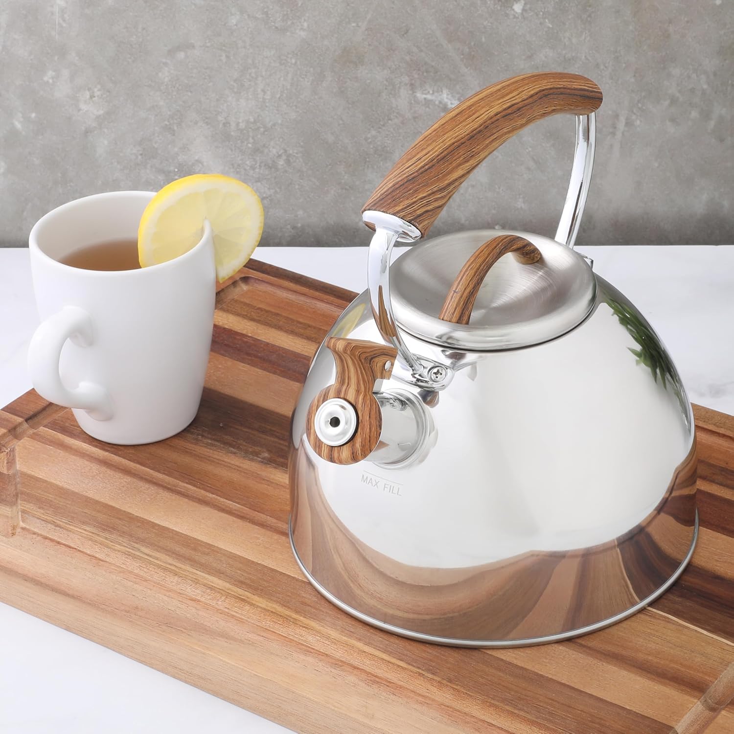 Mr. Coffee Fremont Large 2-Quart Stainless Steel Whistling Tea Kettle with Wood Handle – Durable Stove-Top Kettle for Boiling Water