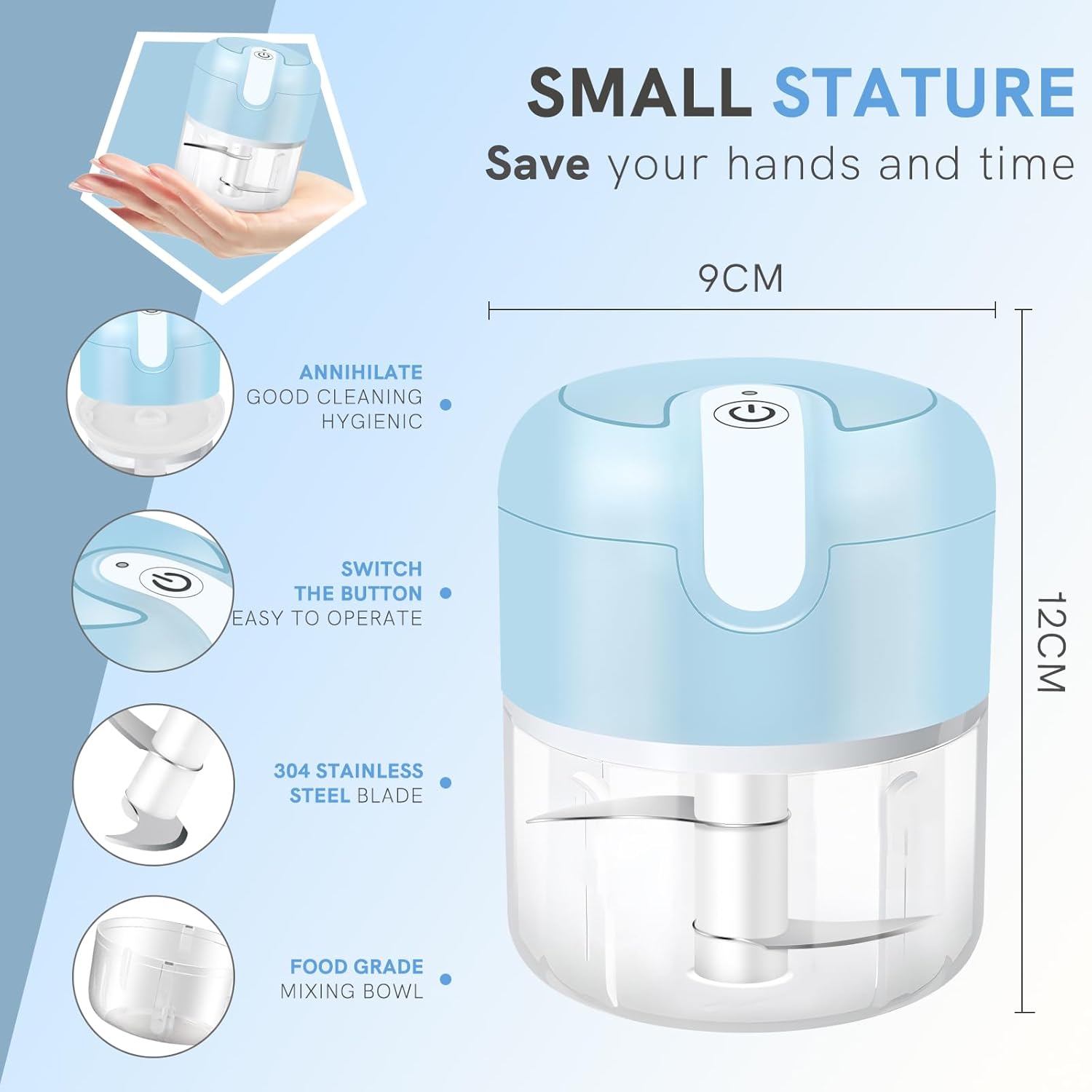 - Healthy and Safe: The electric garlic chopper comes with a food grade PP mixing cup and 304 stainless steel blade. The blender and food processor combo with motor cover design, the motor and motor cover can be separated, and the cover can be cleaned separately, no peculiar smell, clean and hygienic. With safety magnetic lock design, when the motor cover is removed, the motor will stop working to ensure your safety.