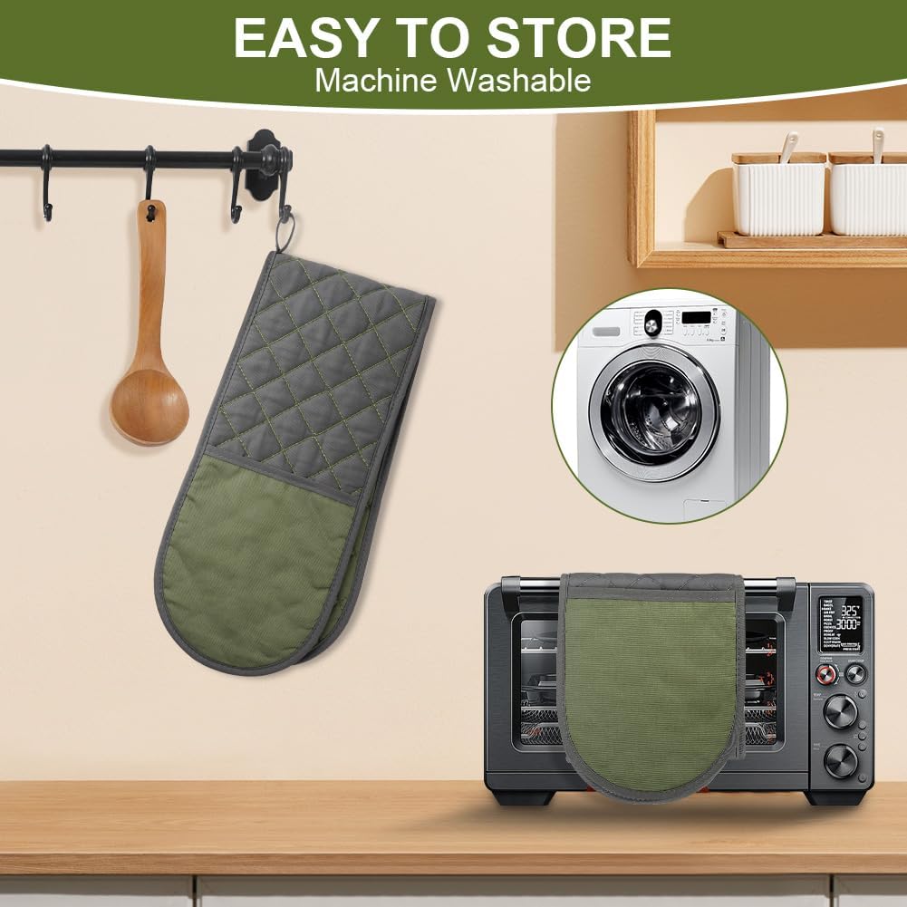- 【DURABLE AND WASHABLE】Our double heat resistant oven mitts are easy to clean, machine washable, safe and dry less. They won't rip, thin or fray thanks to the fine stitching, and the inner cotton won't unravel after washing and can be reused after air drying