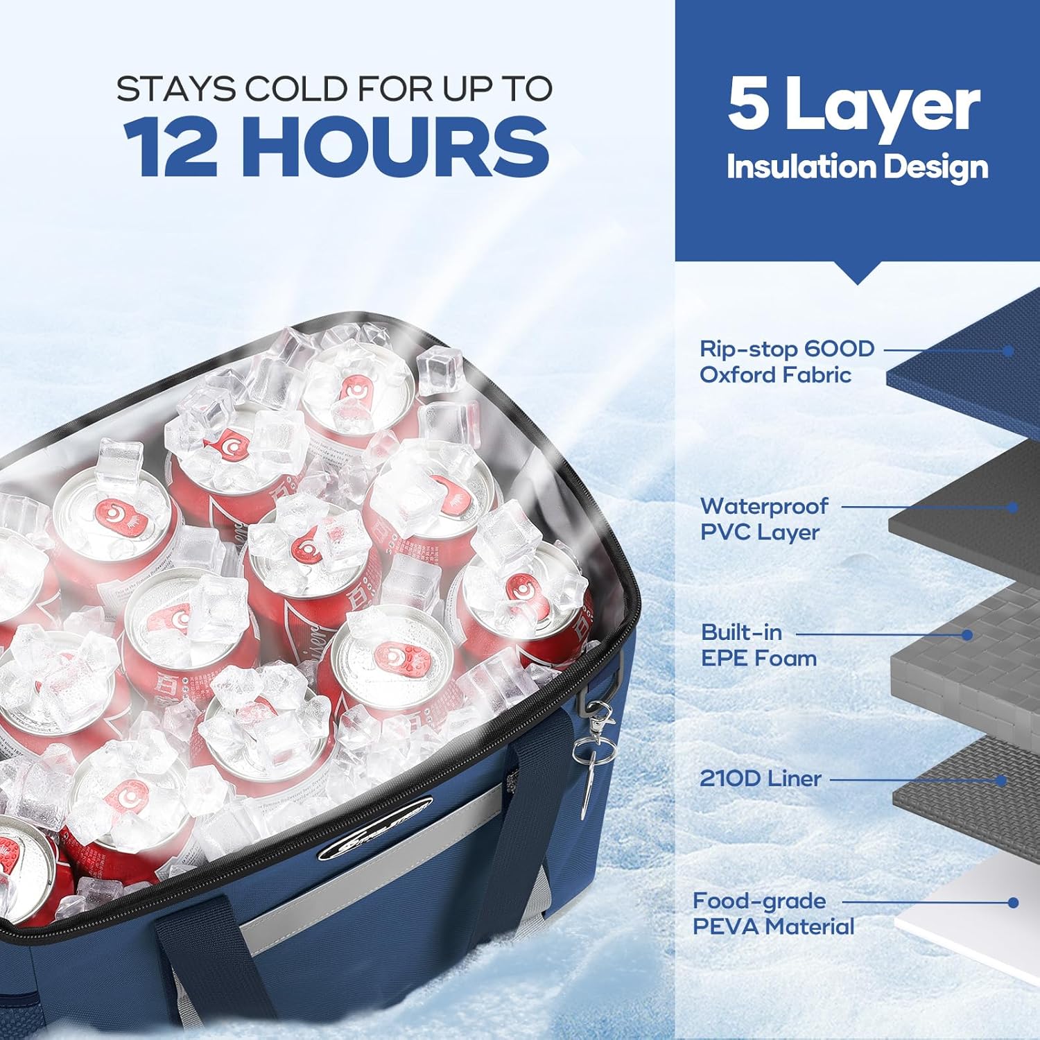- STAYS COLD LONGER - Thoughtful 5 layer insulation design.Exterior surfaces are made of rip-stop 600D Oxford materials plus one layer of waterproof PVC.Interior layers are thicker, reinforced food-grade PEVA materials with seamless ultrasonic welding for 100% leakproof and tear-resistance.A built-in EPE foam middle layer and 210D liner add additional insulation, allowing the Maelstrom Icy Hollow Soft Sided Cooler Bag to keep food or drinks cold for up to 12 hours.