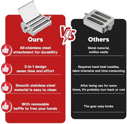 - 3-in-1 pasta maker for kitchenaid mixer attachments: It includes a pasta roller and a spaghetti & fettuccine cutter, more convenient than separate 3-piece pasta rollers. Simply attach it to any KitchenAid stand mixer—roll out dough and cut pasta in one go with no need to switch attachments, drastically boosting efficiency