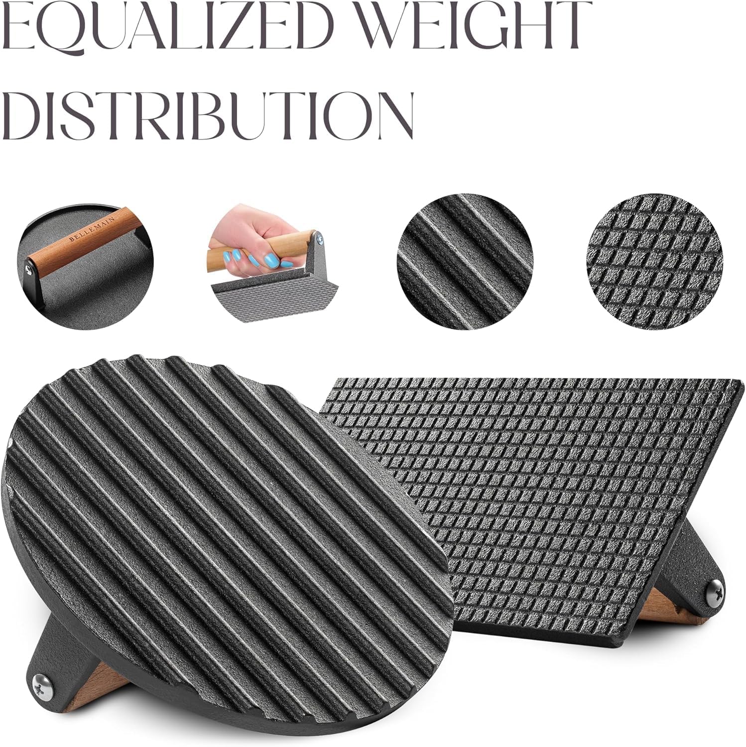 - Master the Art of Grilling with Bellemain's Premium Cast Iron Press Set: Elevate your culinary creations with our heavy-duty cast iron grill press set, designed to deliver perfectly seared smash burgers, crispy bacon, and succulent steaks every time.