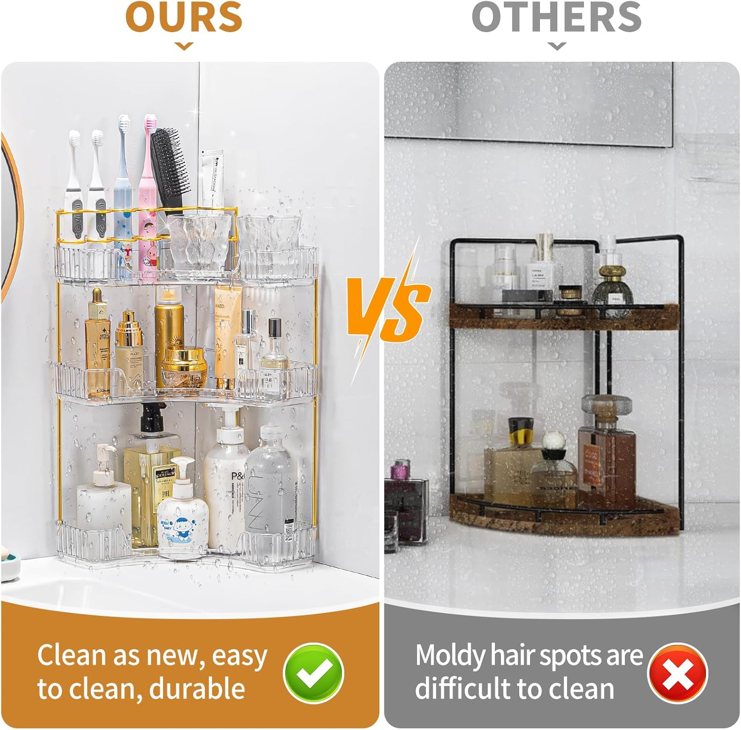 - Upgraded Design with Brush Holder: New 90° corner shelf organizer a stainless steel grid top layer to store beauty sponges, makeup brushes & toothbrushes securely. Say goodbye to cluttered counters – now every item has its place