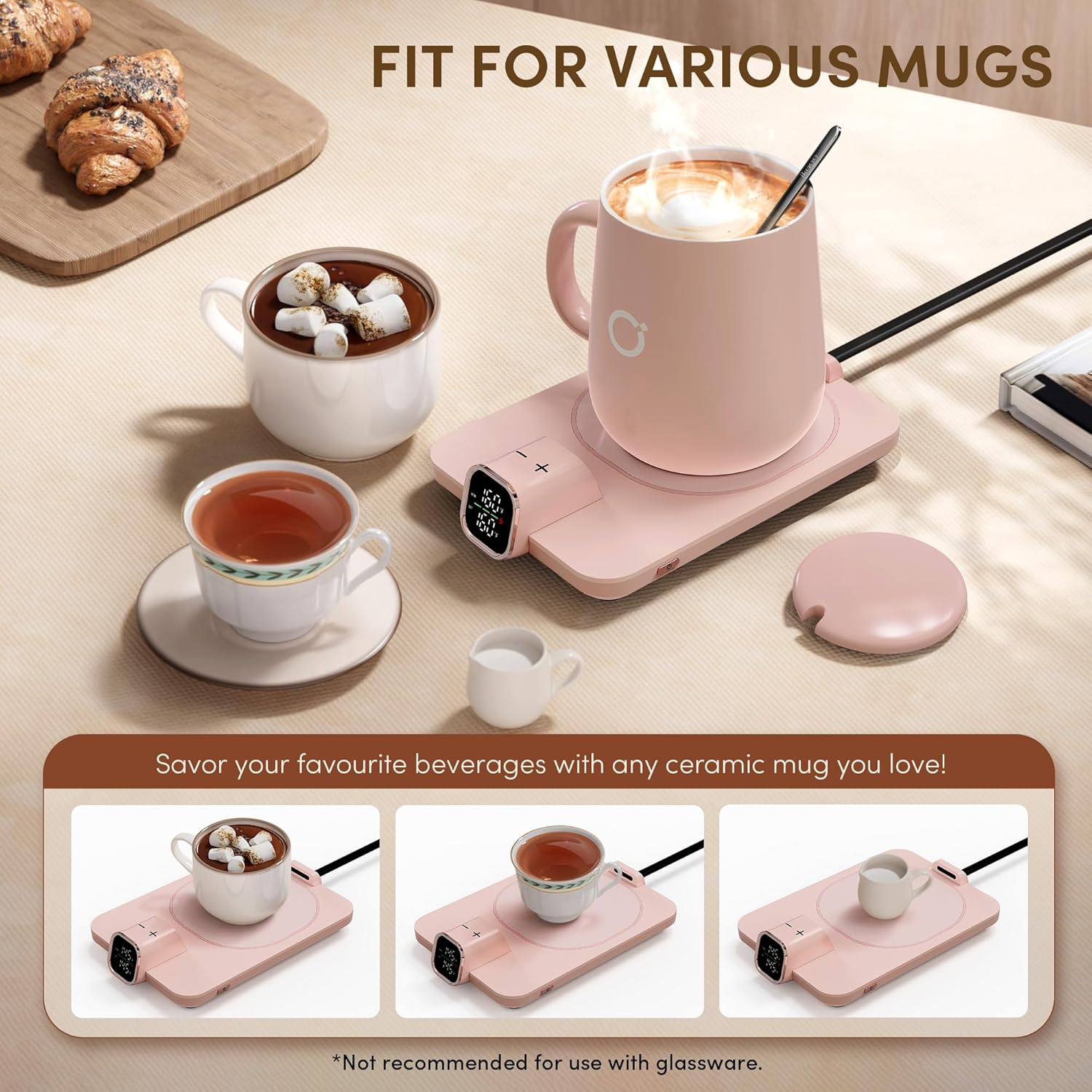 - Universal Compatibility: Designed for most ceramic mugs, it's perfect for coffee, tea, milk, or cocoa. (Note: Not recommended for glass, metal, paper, or insulated cups.) This warmer set thoughtfully packaged with a 15oz ceramic mug, matching lid, stirring spoon, and smart warmer