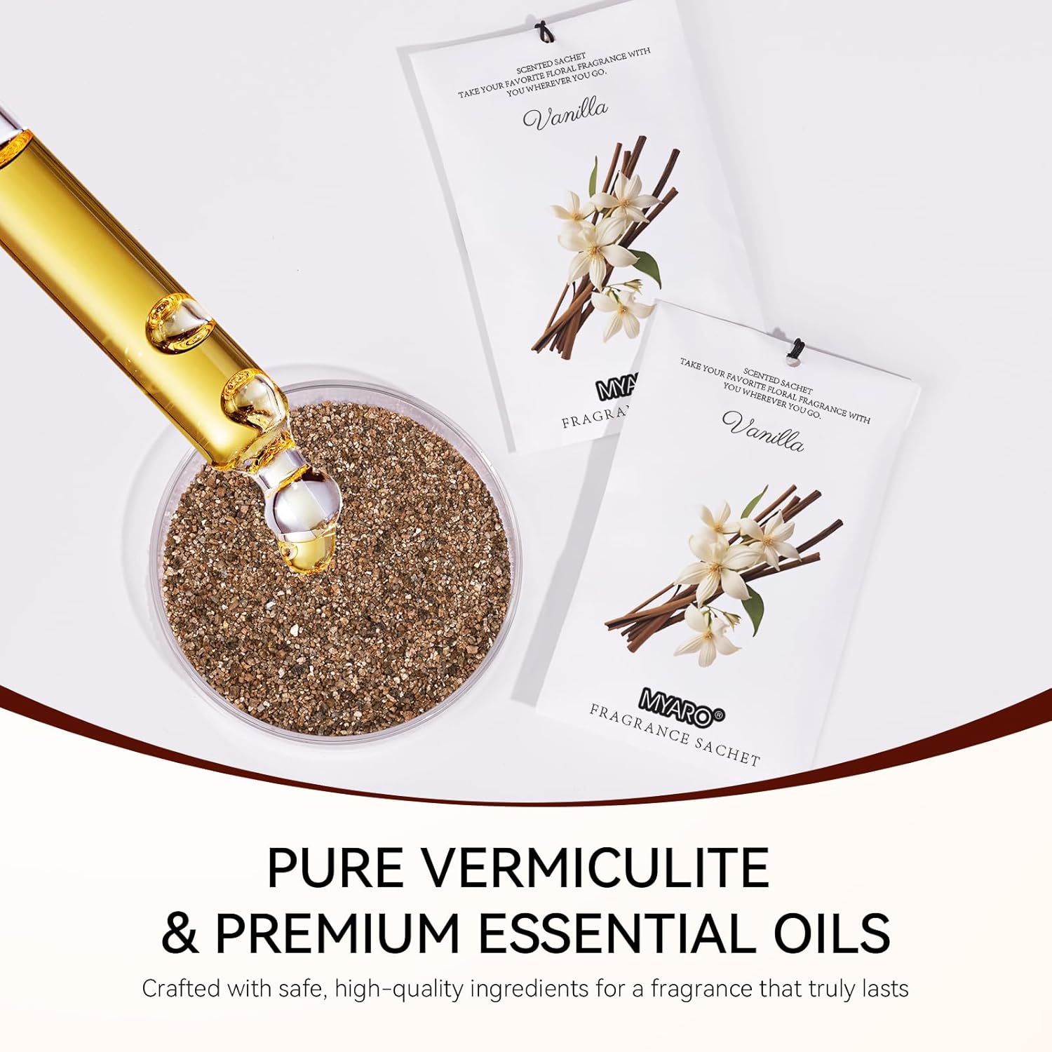 - MYARO Vanilla Sachet Bags: Includes 12 scented sachets (each bag size: 4.13 inch x 2.76 inch). Our natural fragrance will take you on a journey with the fresh scents sachet packets