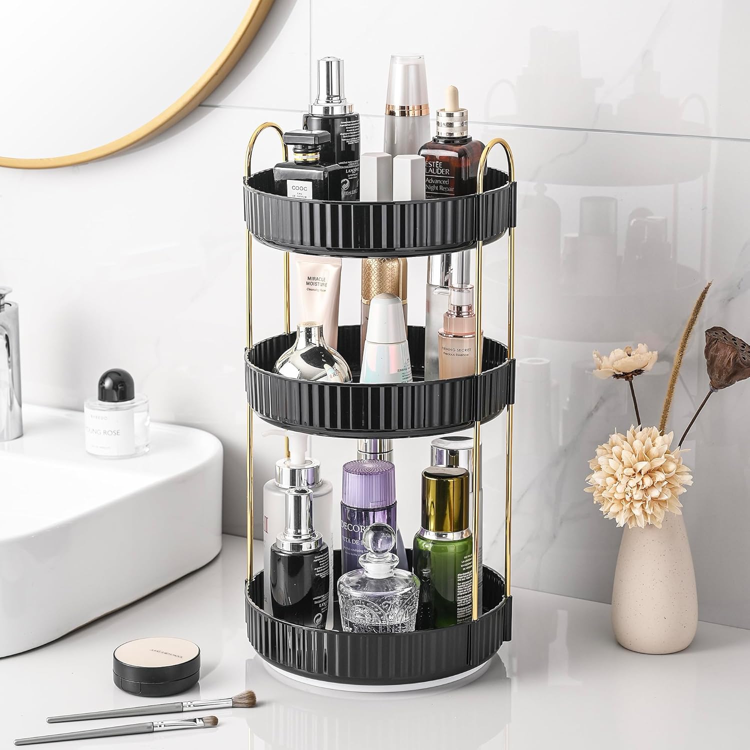 Aveniee 360 Rotating Makeup Organizer for Vanity, Large Spinning Bathroom Counter Organizer Shelf Holder for Cosmetics, Skin Care, Lipsticks,3 Tiers, Black