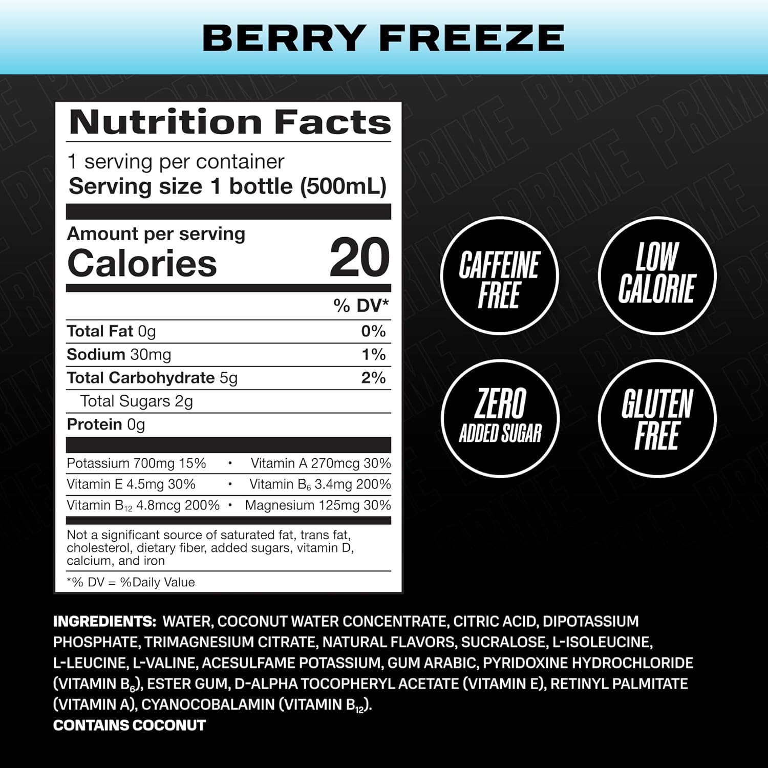 PRIME Hydration BERRY FREEZE, Sports Drinks, Electrolyte Enhanced for Ultimate Hydration, 250mg BCAAs, B Vitamins, Antioxidants, Low Sugar, 16.9 Fl Oz, 12 Pack