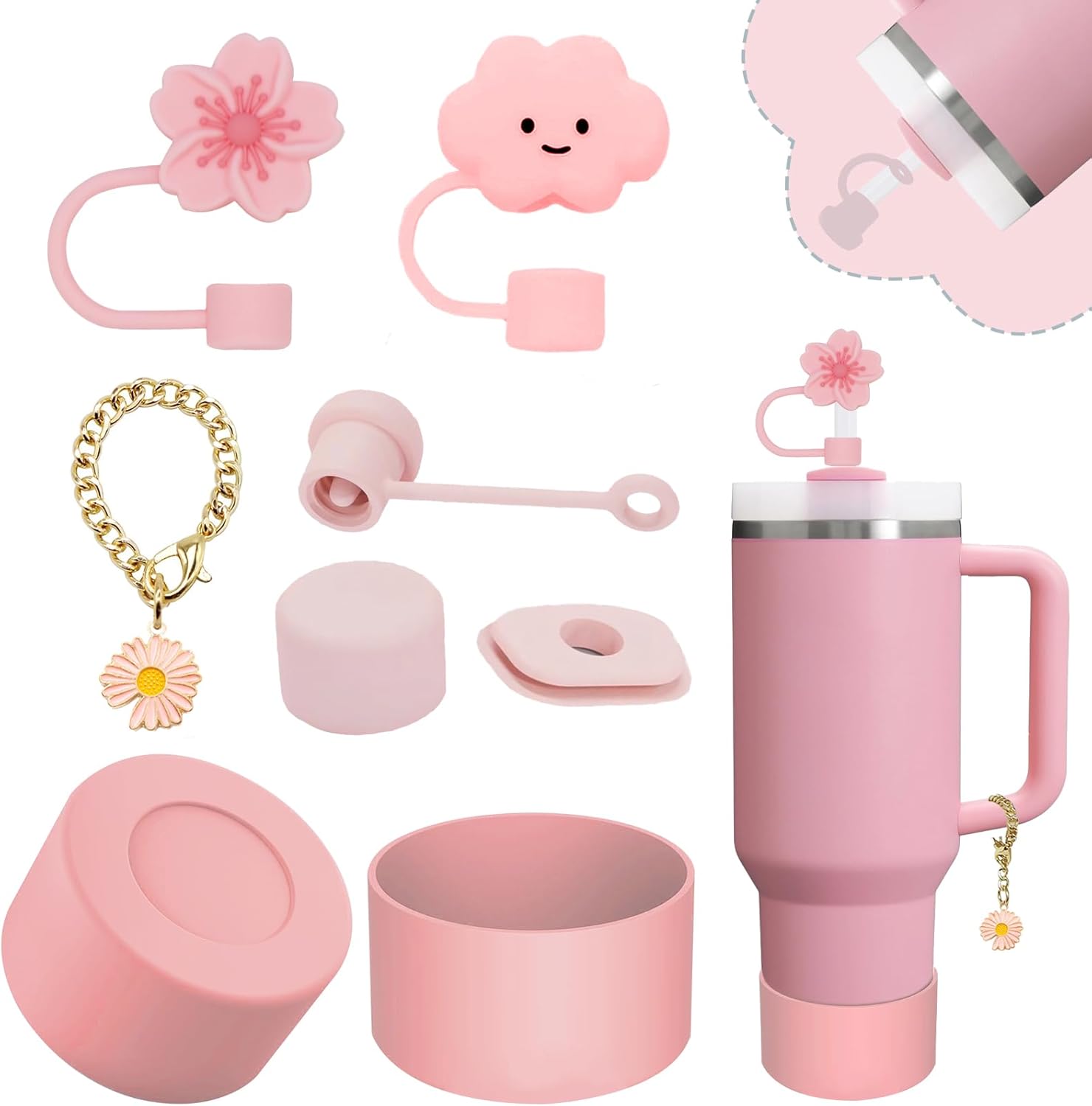Stanley Cup Accessories Set,Including 2 Pcs 0.4in Straw Cover, 1 Silicone Spill-Proof Stopper Set of 3, 1 Cute Flowers Handle Charm, 1 Silicone Boot Fits Stanley 40&30 Oz Tumbler (Pink 2.0)