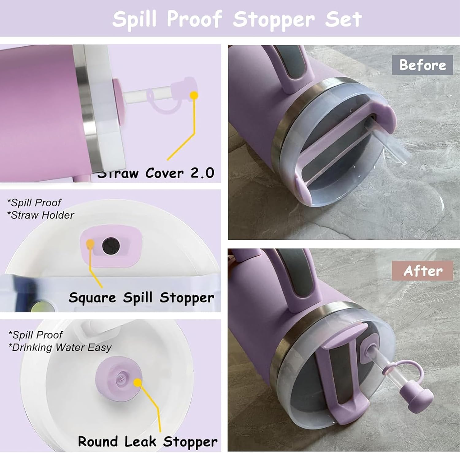- Complete Package: Vikgle Stanley Cup Accessories Set, include 2pcs 0.4 Inch/10 mm Straw Cover Cap, 1pcs Cute Purple Handle Charm, Spill Proof Stopper Set of 3pcs and 1Pcs Silicone Boot. Suitable for Stanley Quencher 30/40 oz and Stanley IceFlow 20/30 oz tumblers water bottles & others cup bottom diameter 2.75-2.95 inch