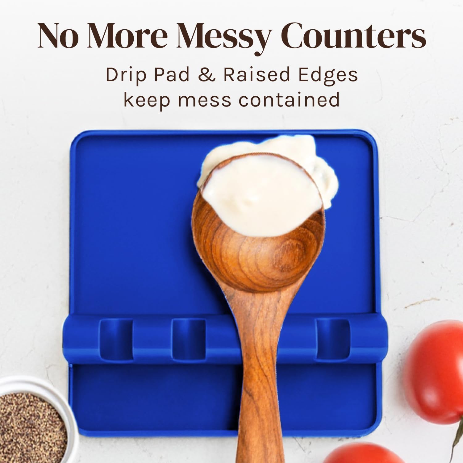 Blue Silicone Spoon Rest for Stove Top with Drip Pad (Two Pack) - Heat Resistant BPA Free Utensil Rest & Spoon Holder for Kitchen Counter - Grill Utensil Holder - Spatula Holder, Tongs, Ladle