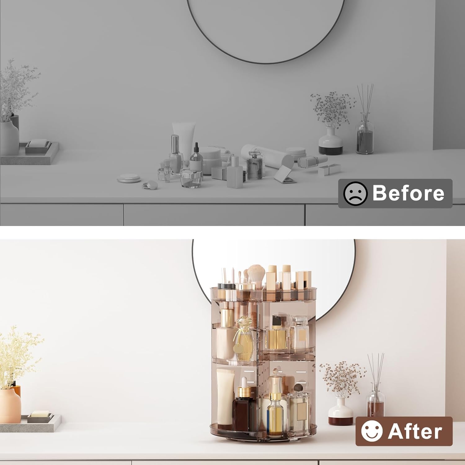 360 Rotating Makeup Organizer with Lipstick Slots, DIY 8 Adjustable Height Spinning Skincare Organizers, Brush and Perfume Storage Carousel, Cosmetic Display Case for Vanity Bathroom Countertop