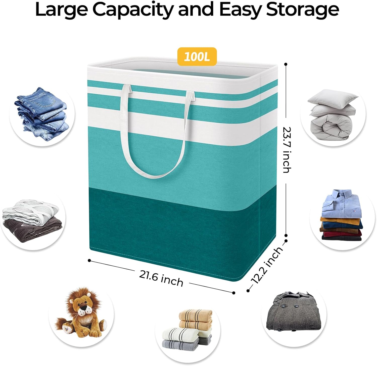 - Extra Large Capacity:The laundry hamper measures 21.6" x 12.2"x 23.7" (L x W x H) with 100L large capacity. This clothes basket can hold clothes, pillows, baby toys, etc. Good choice for campus dorms or family life.