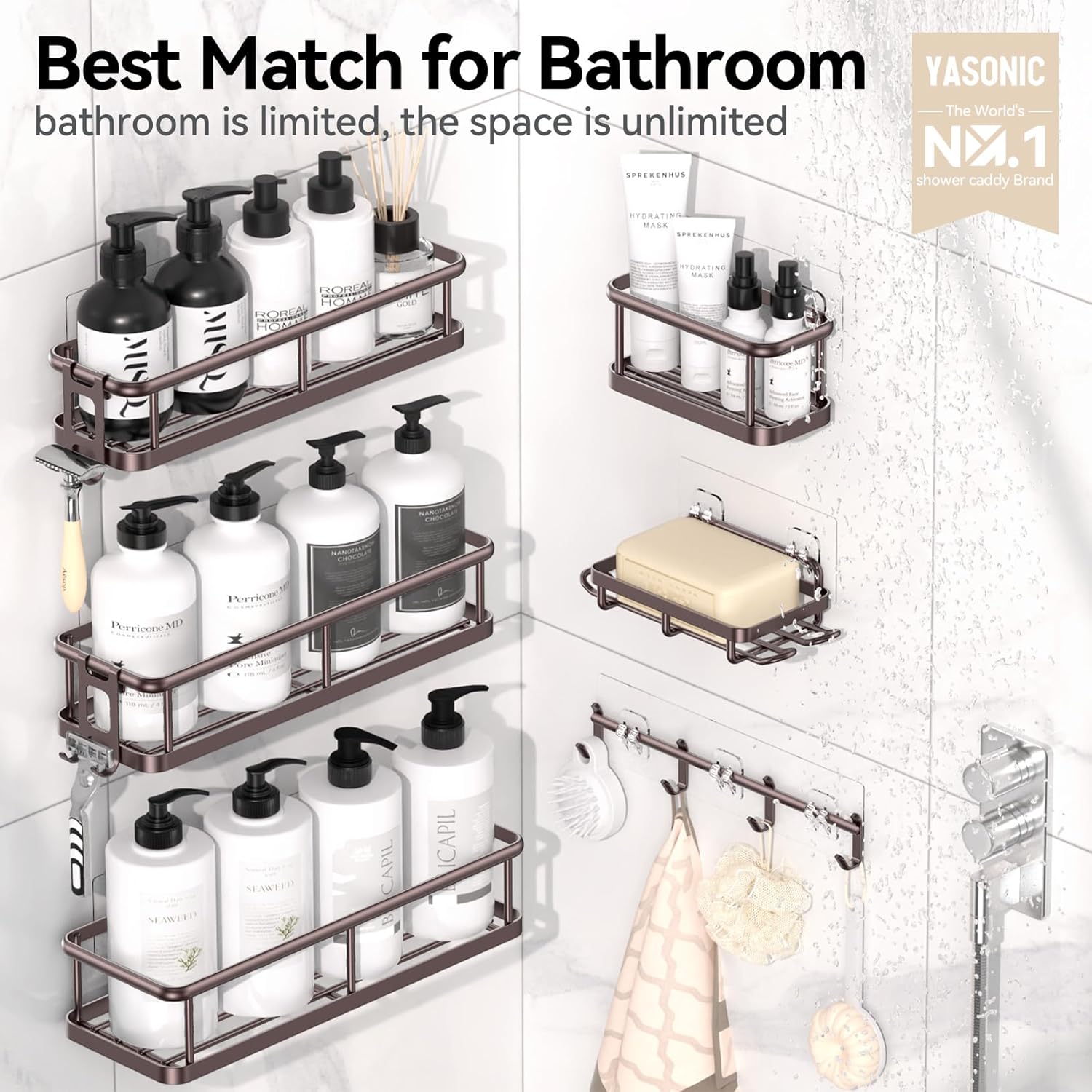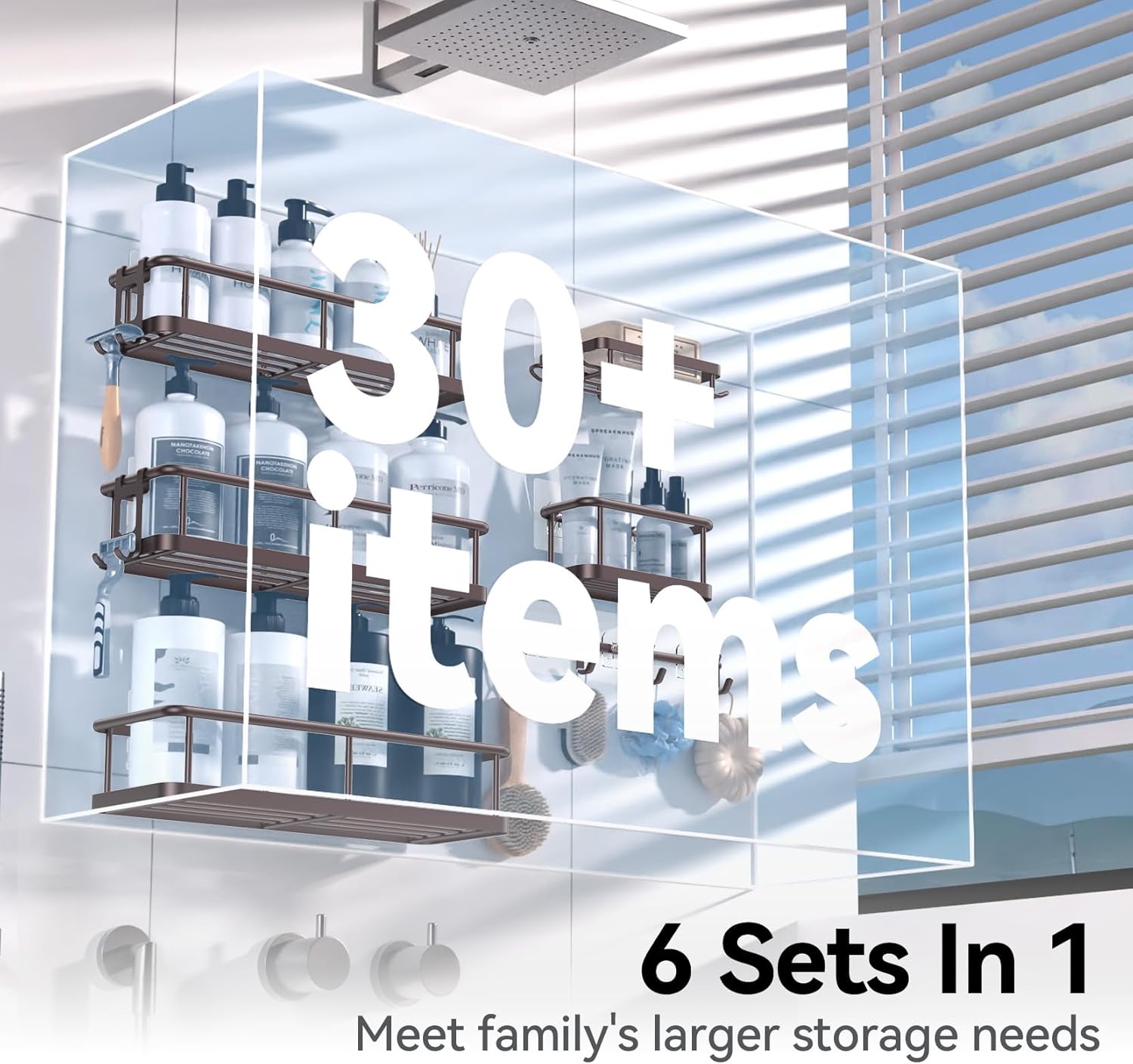- Game Changer for Shower Storage: The 6-piece large capacity shower caddy set comes with 5 different storage solutions to match all your shower essentials, including large caddy X3 for large shampoo bottles, mini caddy X1 for small bottles, shower soap holder X1 for soap bar, little hook X 2 and a row of hooks for hanging razors, towels, loofahs and so on. It is a game changer for enhancing your bathroom space and simplifying your life
