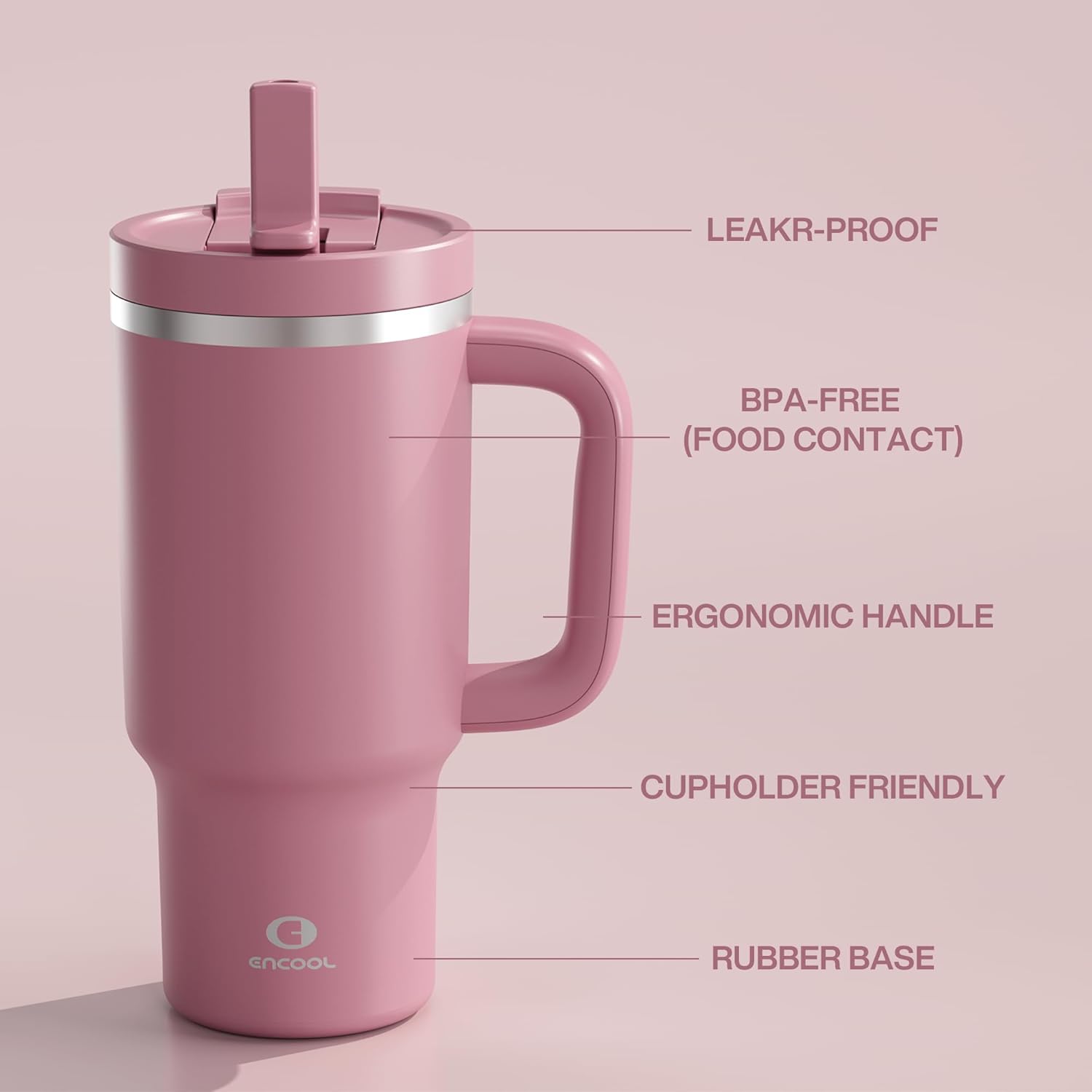 ENCOOL 32 oz Tumbler with Handle and Straw: Stainless Steel Insulated Tumbler Keeps Cold for 24 Hours, Leakproof Travel Cup Fits in Cup Holder and BPA-Free,Turkish Rose