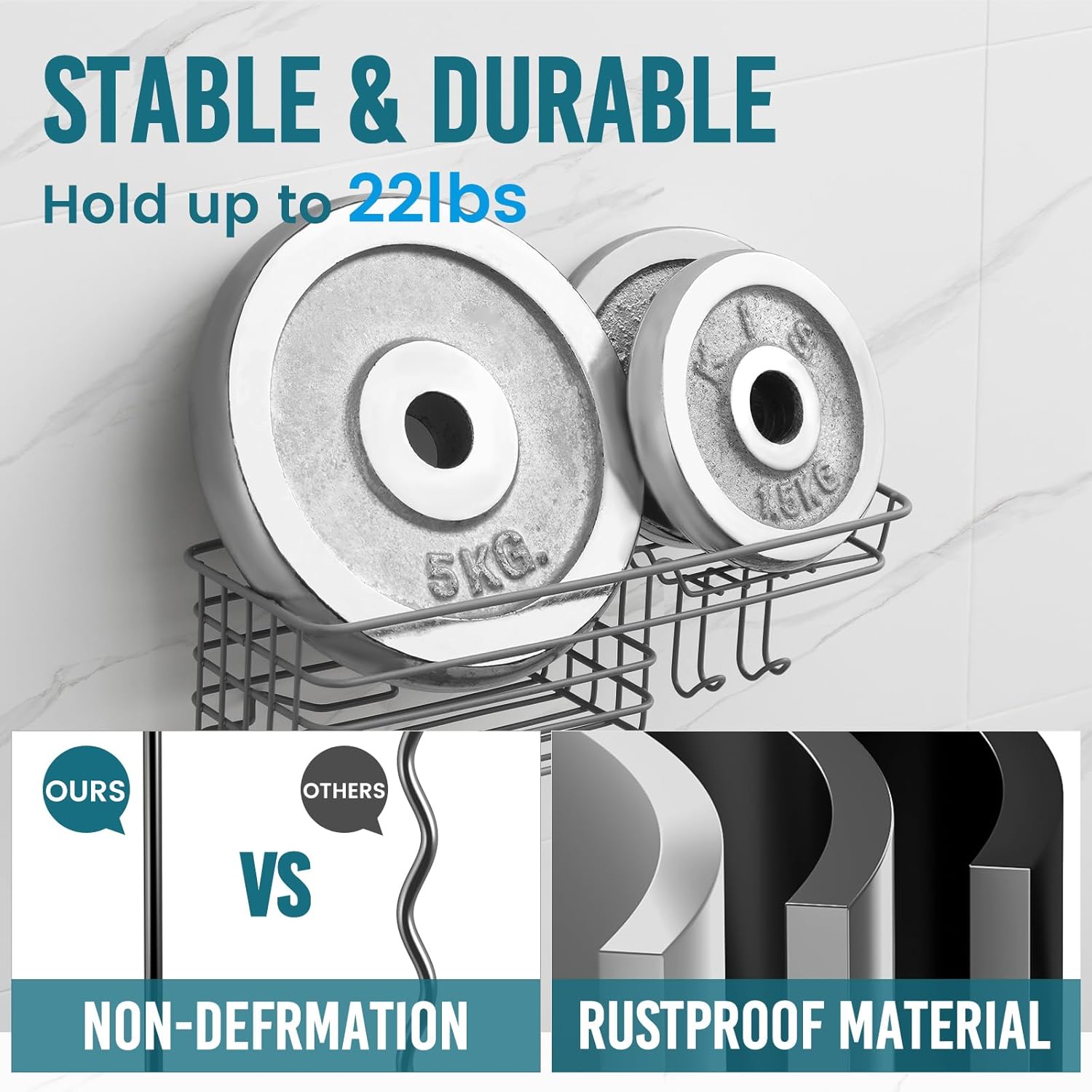 - Durable & Strong Suction: Our suction cup based on the bionics octopus sucker principle is made of TPE material. Each suction shower caddy with 2 suction cups holds up to 22 lbs. Shower caddy suction cup is waterproof and keeps stable and sturdy when showering without any concerns