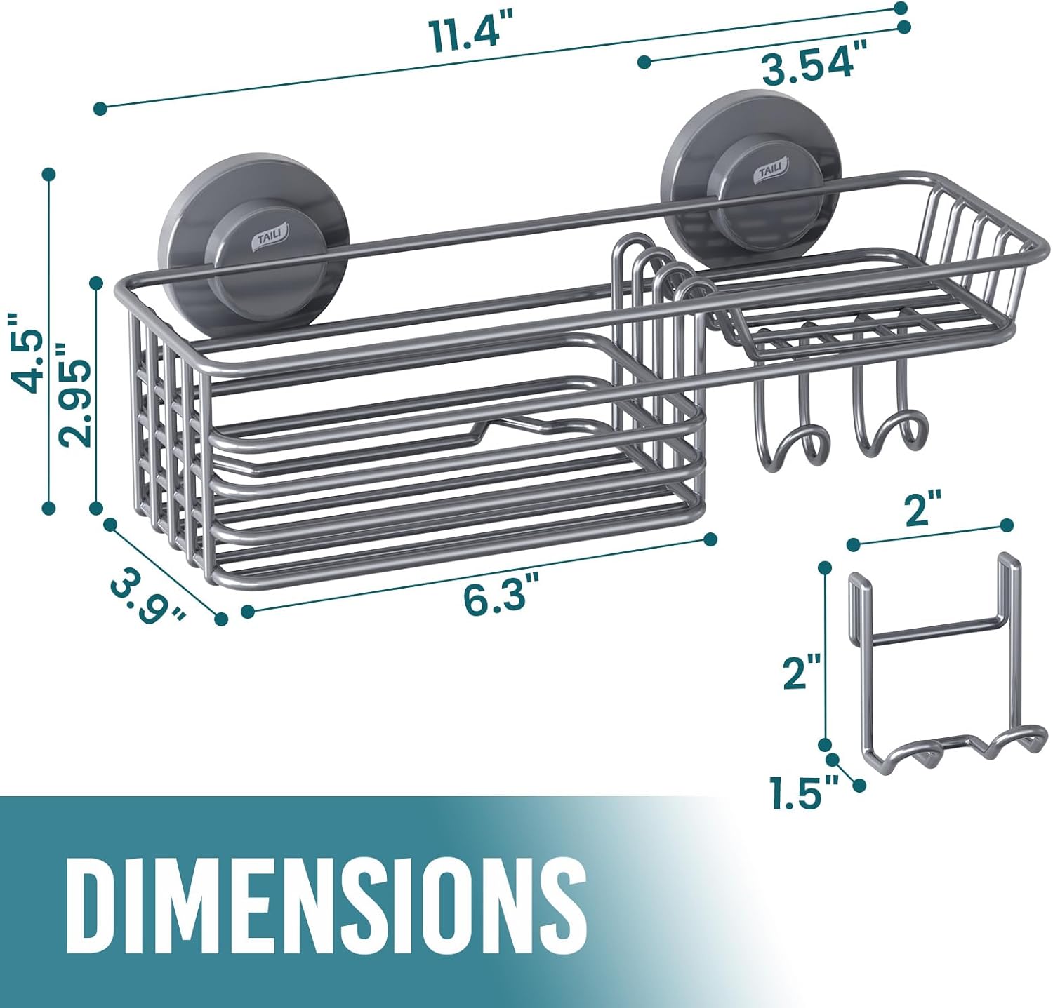 TAILI Shower Caddy Suction Cup with Hooks & Soap holder, Heavy Duty Bathroom Shower Organizer, No Drilling Shower Shelves for Inside bathroom, Metal Storage Basket-Grey
