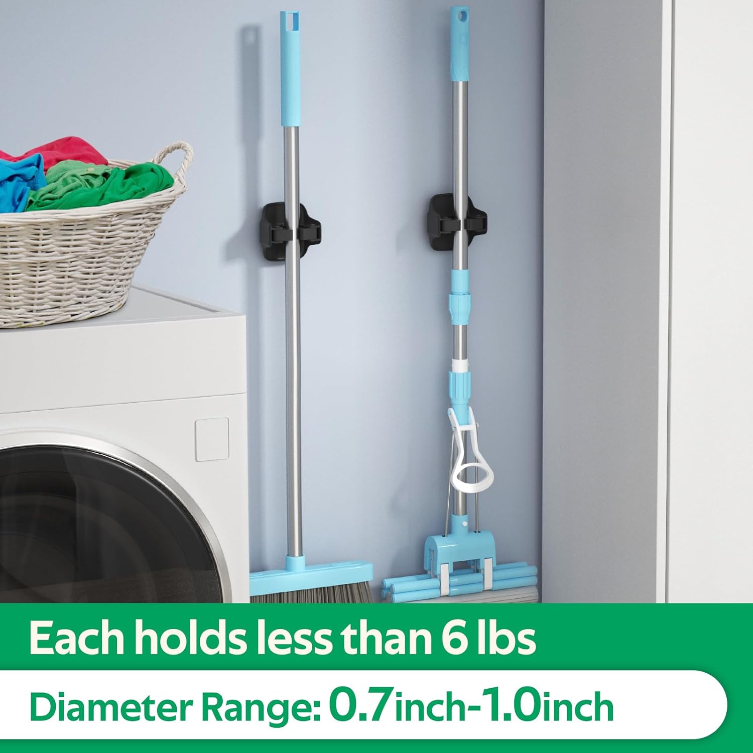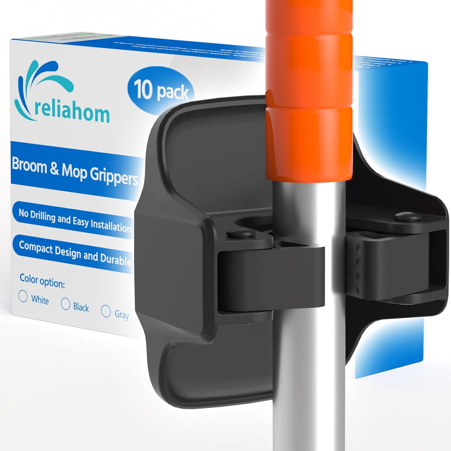 reliahom 10 Pack Broom Holder Wall Mount Mop Grippers No Drilling Self Adhesive Anti-Slip Mop Handle Hanger Dustpan and Broom Organizer Garage Storage Racks-Black