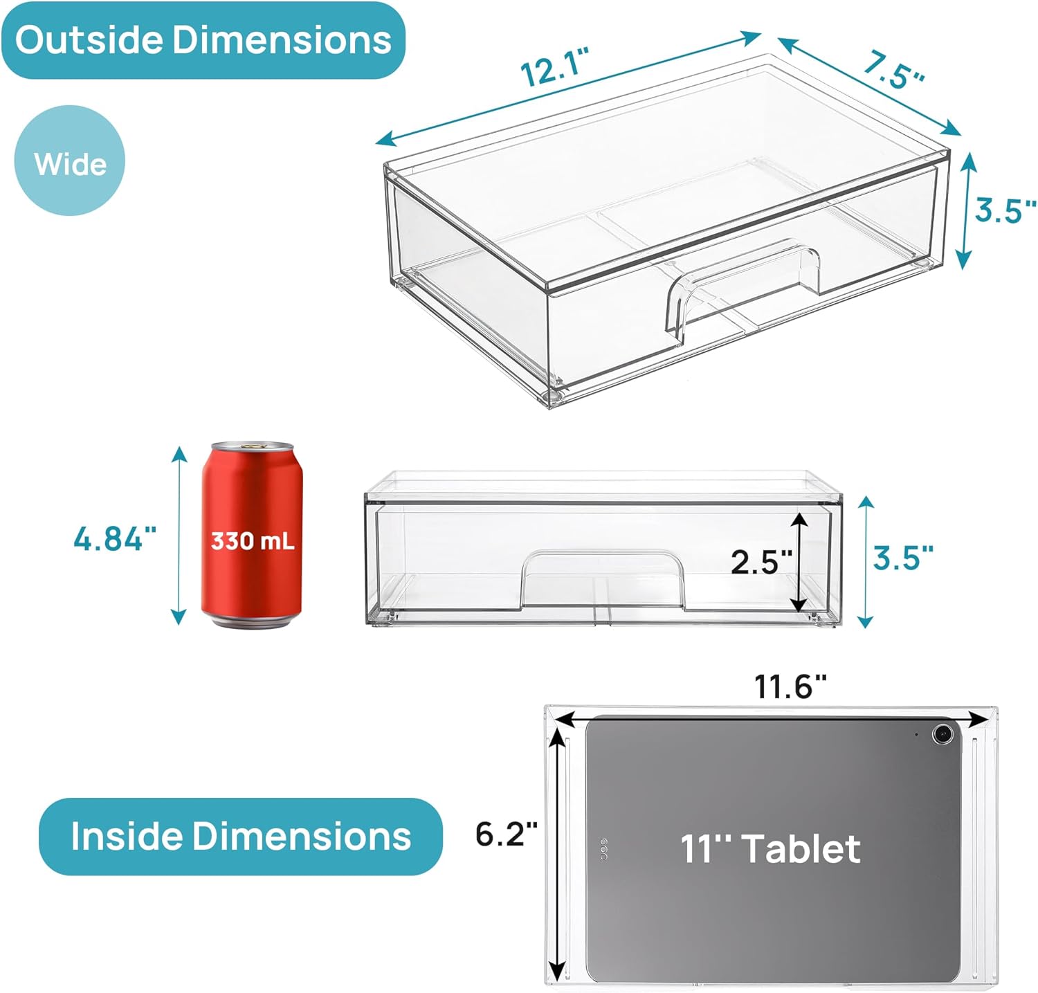 - [Stackable Design] Come with 8 drawer storage organizers, the outside box measures 7.5"D x 12.1"W x 3.5"H,the drawer measures 6.2"D x 11.6"W x 2.5"H,it is usable size.The storage containers are stackable, vertical storage will save a lot of space. You can also use them side by side. Put your small objects on top of acrylic bins to make your countertop space more tidy.