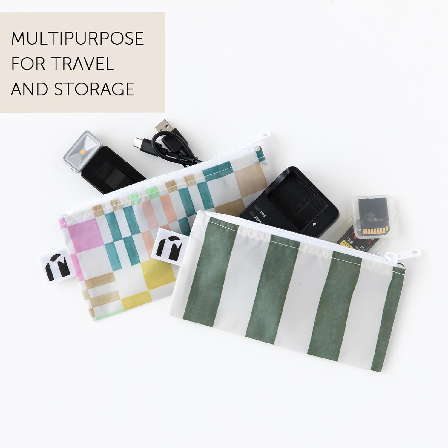 Roamio Reusable Snack Bags, for Kids School Lunch and for Adults Portion, Washable Fabric, Waterproof Cloth Zip Bag, Supplies Pack Travel Pouch, Food-Safe Storage, 2-pk Green Stripe and Multi Check