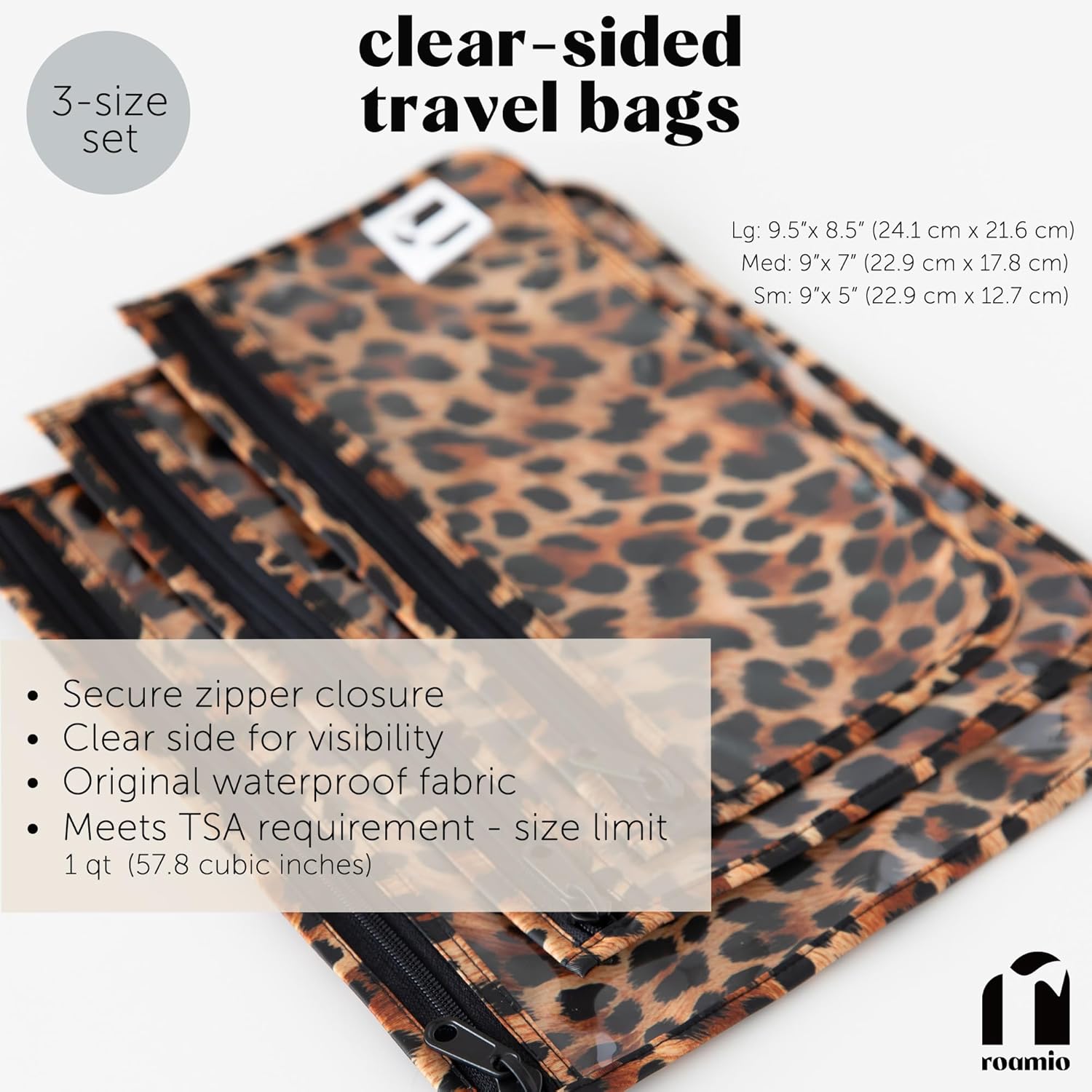 Roamio Travel Bag, Toiletry, TSA Approved Pouch, Zip Quart Size Airline Compliant, Clear-Sided, Baby, Diaper Bag Organization, Makeup, Accessories, Carry On Packing, Set of 3 Sizes, Leopard Print