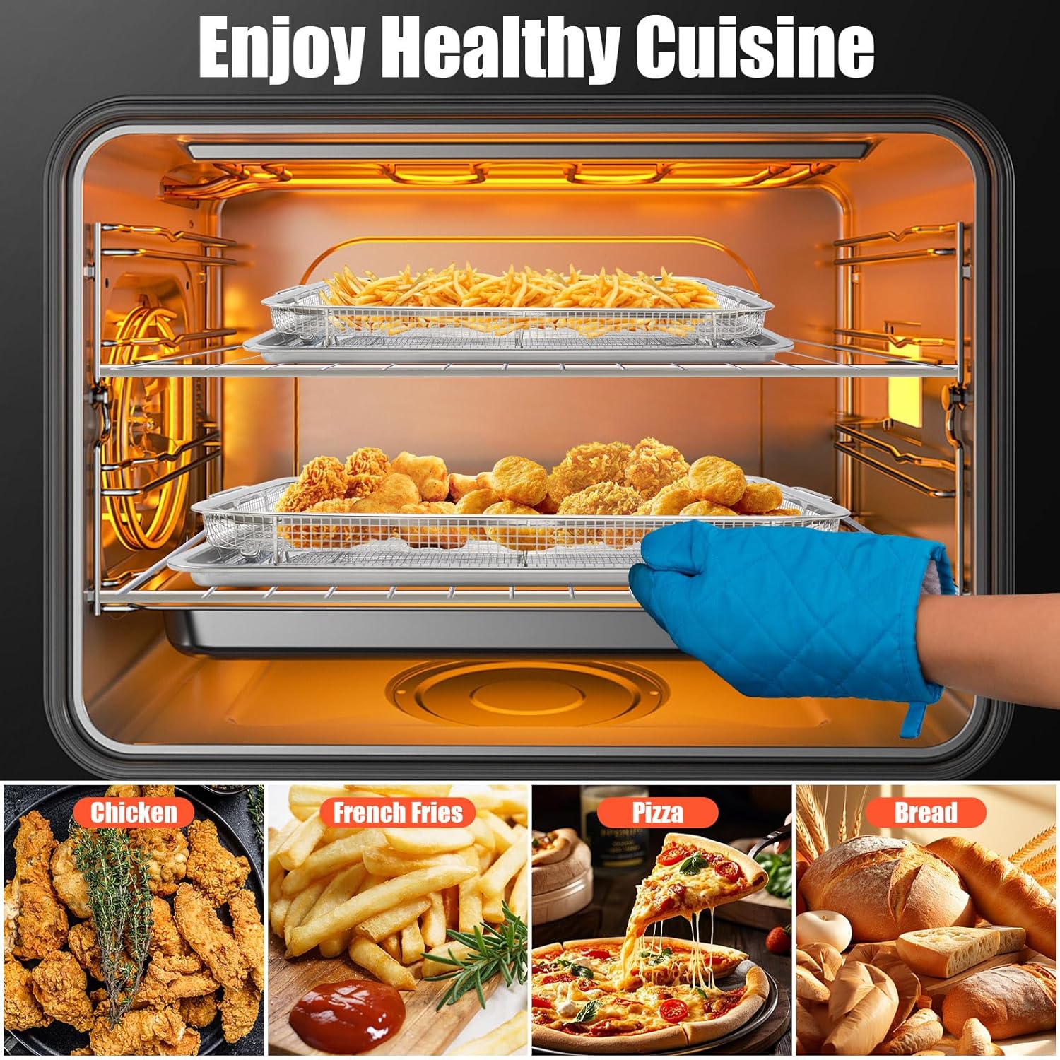 - 【Healthy and Less Oil】The Air fryer basket mesh design ensures that food is heated evenly for a crispy texture, and the tray's 2-in-1 design allows excess grease and food crumbs to drip off, maintaining healthy cooking and oven cleanliness.