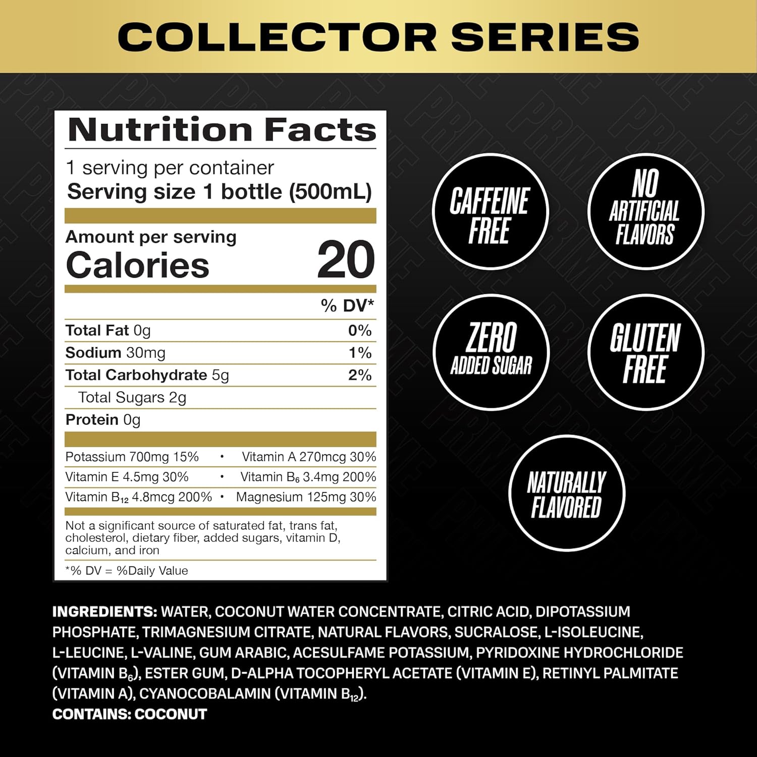 - NO ARTIFICIAL COLORS OR FLAVORS: Every bottle is naturally flavored and contains zero caffeine, zero added sugar, no artificial colors, and is gluten free. With 834mg of electrolytes, essential B vitamins, antioxidants, and coconut water, Prime delivers clean, functional hydration when you need it most.