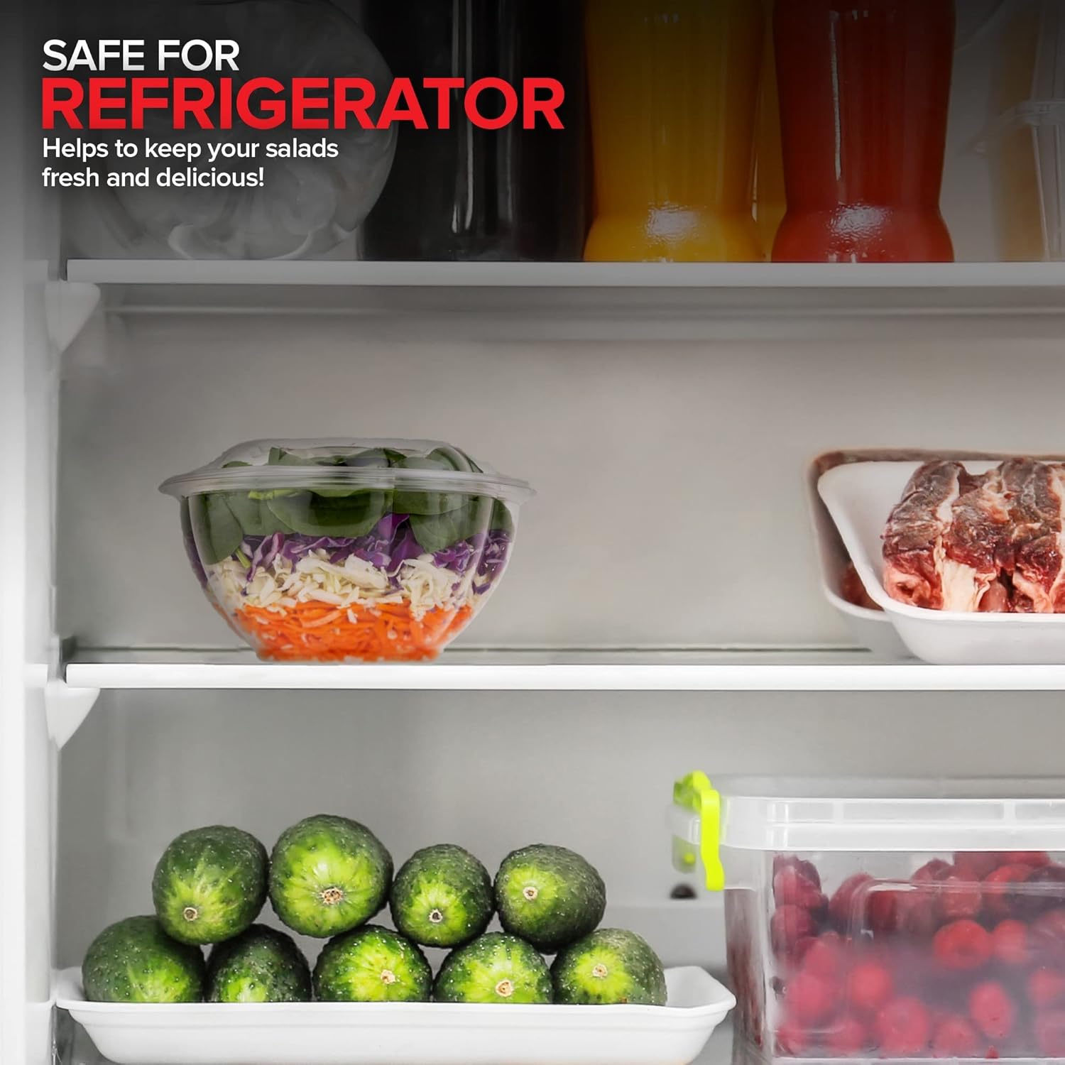 - Disposable: Made of durable plastic, our extra large salad bowls with lids are BPA-free, food safe, and recyclable. When you're done, simply toss them in the trash for easy clean-up.