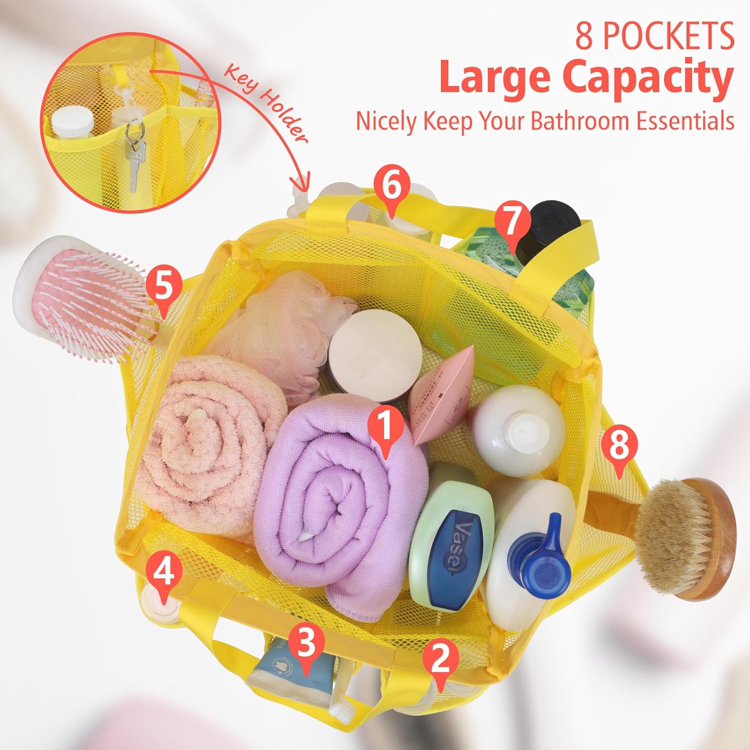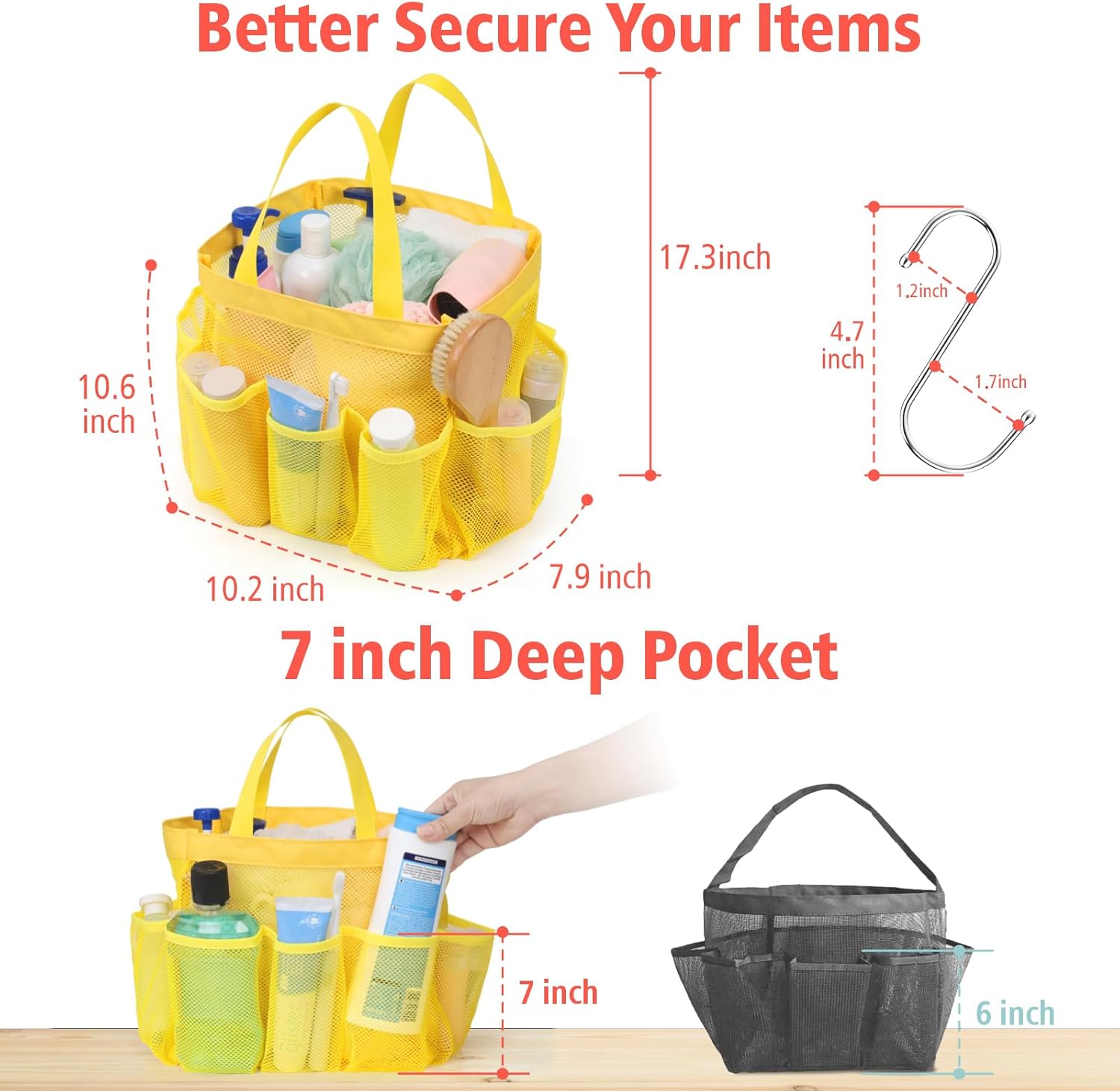 F-color Mesh Shower Caddy Portable, Upgrade Deeper 7 Pockets Shower Bag Basket Tote for College Dorm Room Toiletry Bathroom Essentials Gym Camp Quick Dry 2 handles with S Hook, Yellow