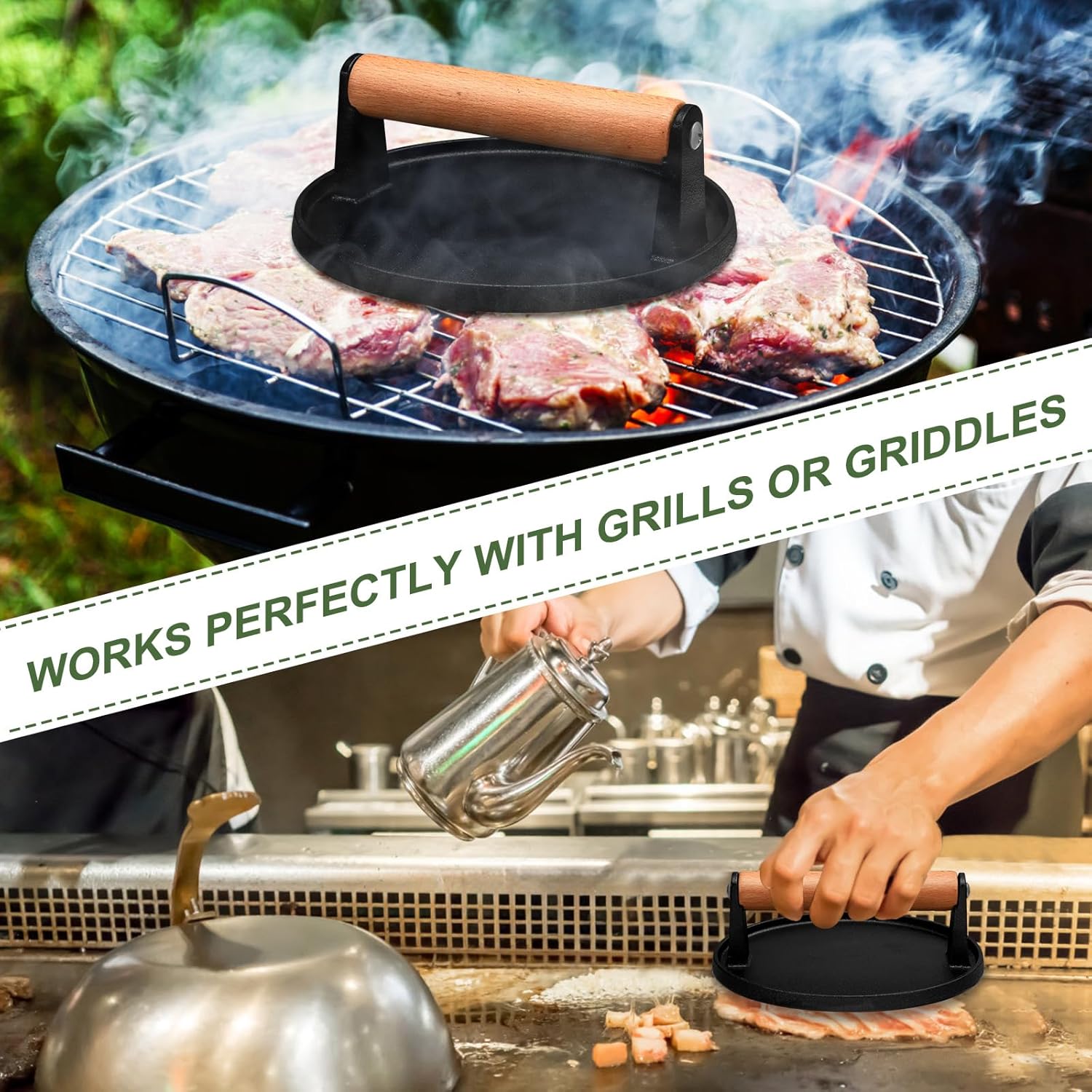 EWFEN Cast Iron Smash Bacon Press Meat Steak with Wood Handle, Burger Press(Round with Flat Bottom)
