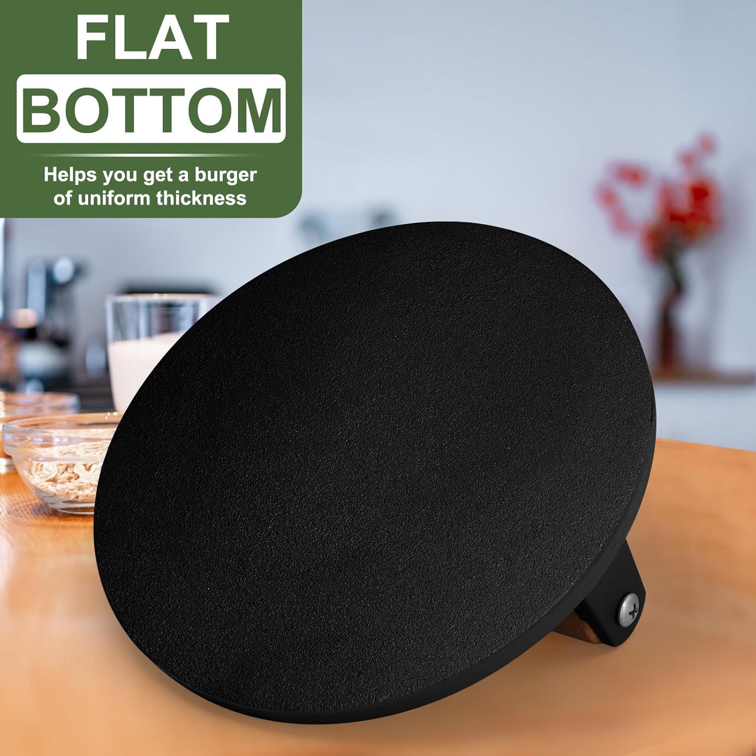 - 【SAFE-TOUCH ,COMFORT-GRIP WOOD HANDLE】: Wooden handle, has ergonomic design to reduce hand fatigue while ensuring a secure and comfortable grip. Made of natural wood, the handle of meat press is smooth without any burrs, insulate heat transfer that's heat-proof and always remain cool to touch. Firmly attached to the cast iron smash burger press with two screws.
