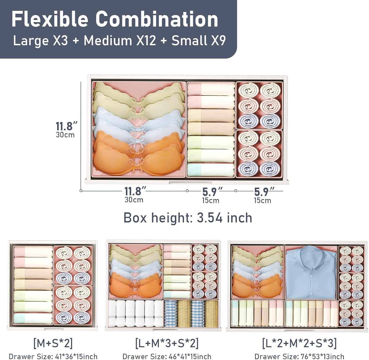- What's Include: These Non-Woven fabric drawer organizer Includes 3 large square Drawer organizer bins,12 medium rectangular organizer bins and 9 small square organizer bins that can hold a variety of personal items. These Fabric foldable dresser storage fits all.